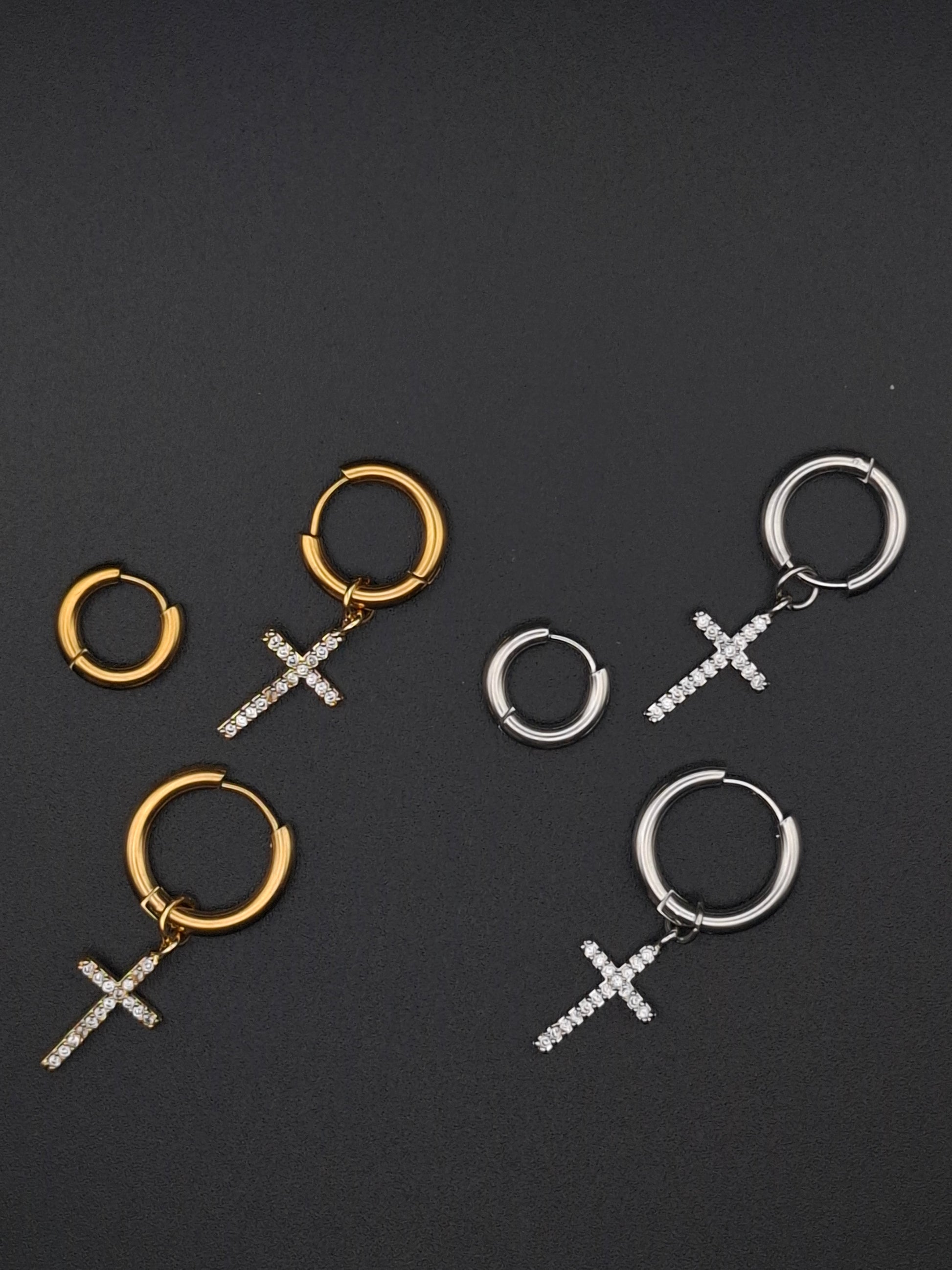 Διαχρονικά κρίκοι από ανοξείδωτο ατσάλι, διακοσμημένοι με λαμπερό σταυρό από ζιργκόν. Ιδανικά για layering ή ως μοναδικό statement κόσμημα. Διατίθενται σε χρυσή και ασημί απόχρωση.