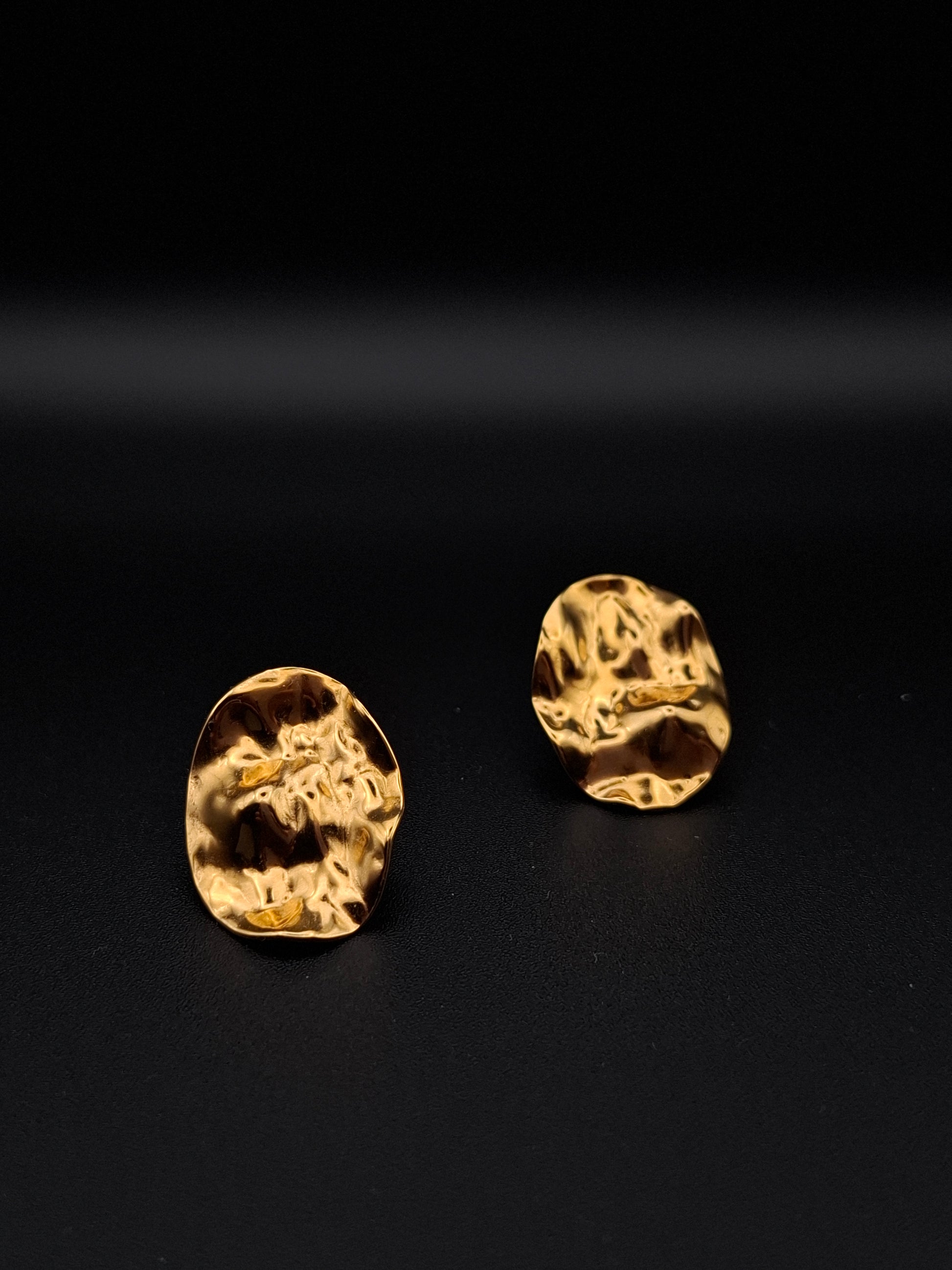 Εντυπωσιακά σκουλαρίκια από ανοξείδωτο ατσάλι σε χρυσή απόχρωση, με ακανόνιστο, σφυρήλατο σχέδιο που αποπνέει μοντέρνα κομψότητα. Ιδανικά για statement εμφανίσεις που ξεχωρίζουν.