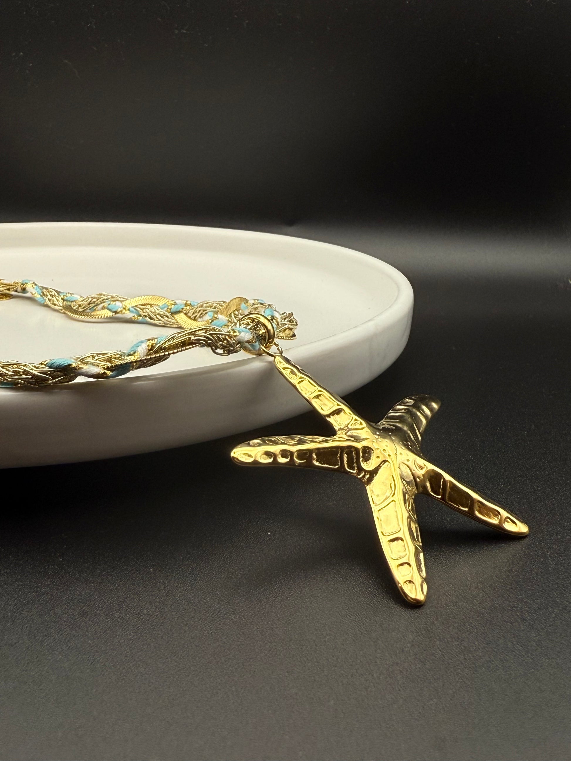 Ανακαλύψτε τη μαγεία της θάλασσας με το κολιέ Stella Maris, εμπνευσμένο από τη γοητεία των ωκεανών και τη λάμψη του καλοκαιρινού ήλιου. Με εντυπωσιακό μενταγιόν σε σχήμα χρυσού αστερία και πλεκτή αλυσίδα σε αποχρώσεις του γαλάζιου και του χρυσού, είναι κατασκευασμένο από ανοξείδωτο ατσάλι για να διατηρεί τη λάμψη του στον χρόνο. Ένα κόσμημα που συνδυάζει κομψότητα και καλοκαιρινή αύρα – ιδανικό για κάθε στιγμή.