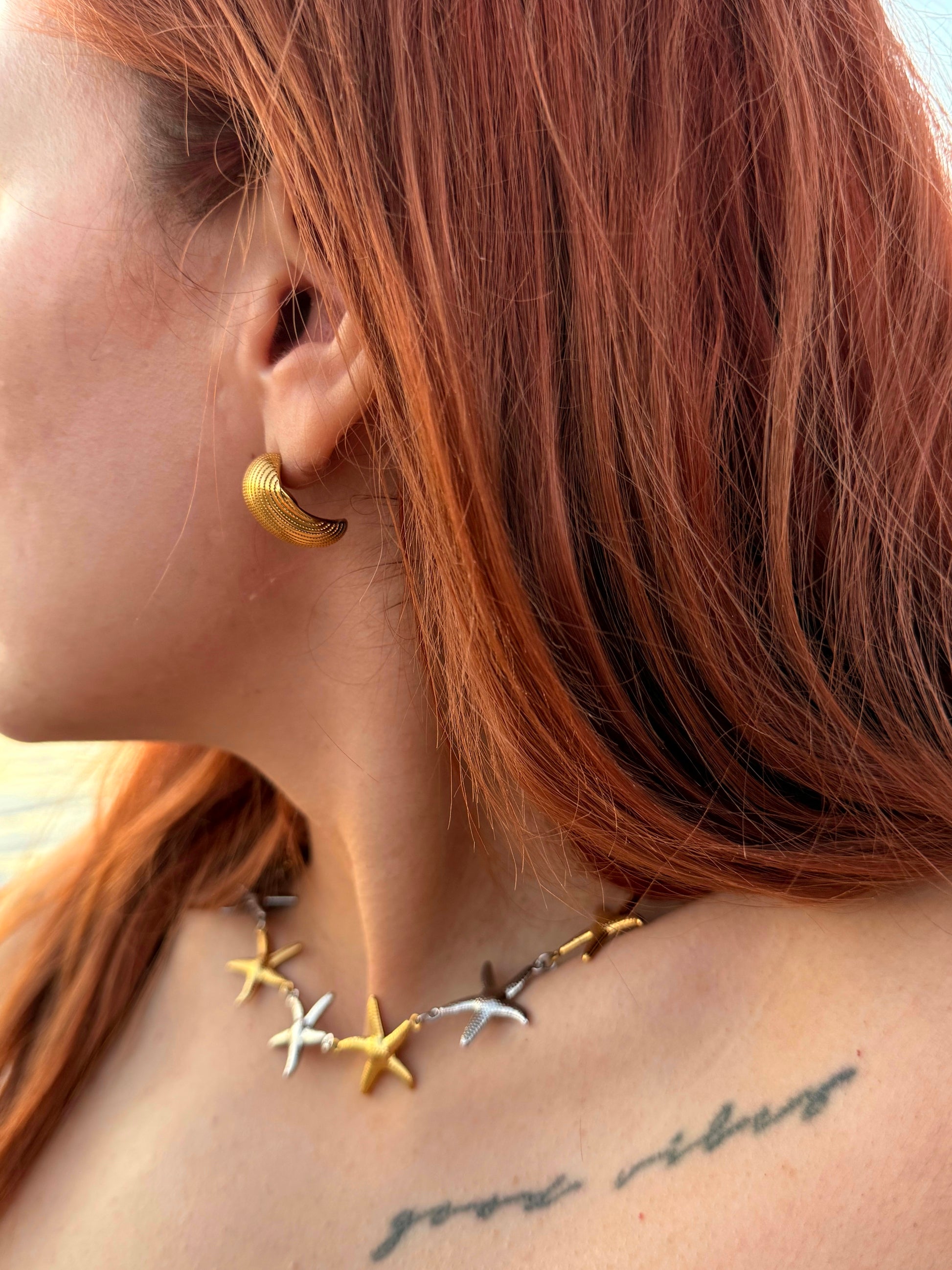 Κολιέ με αστερίες σε χρυσό και ασημί χρώμα, φτιαγμένο από ανοξείδωτο ατσάλι υψηλής ποιότητας. Το Argentea Stella είναι κομψό και μοντέρνο κόσμημα εμπνευσμένο από τη μαγεία της θάλασσας. Ιδανικό για καθημερινή χρήση, δεν μαυρίζει, δεν αλλοιώνεται