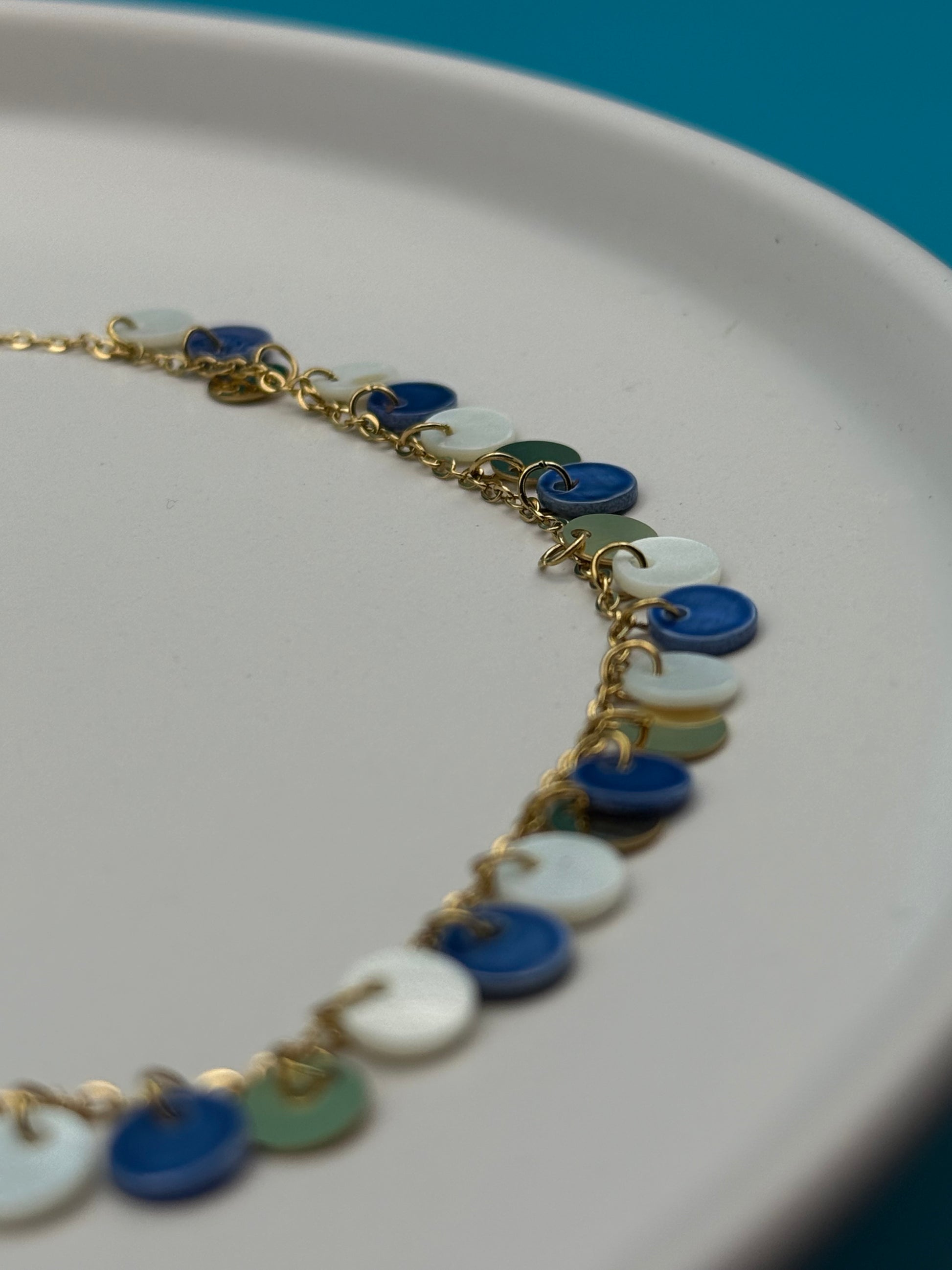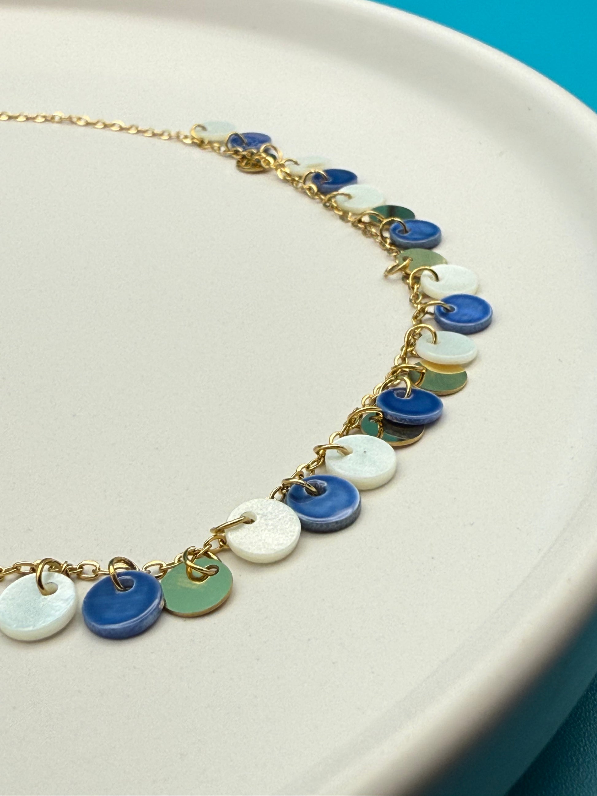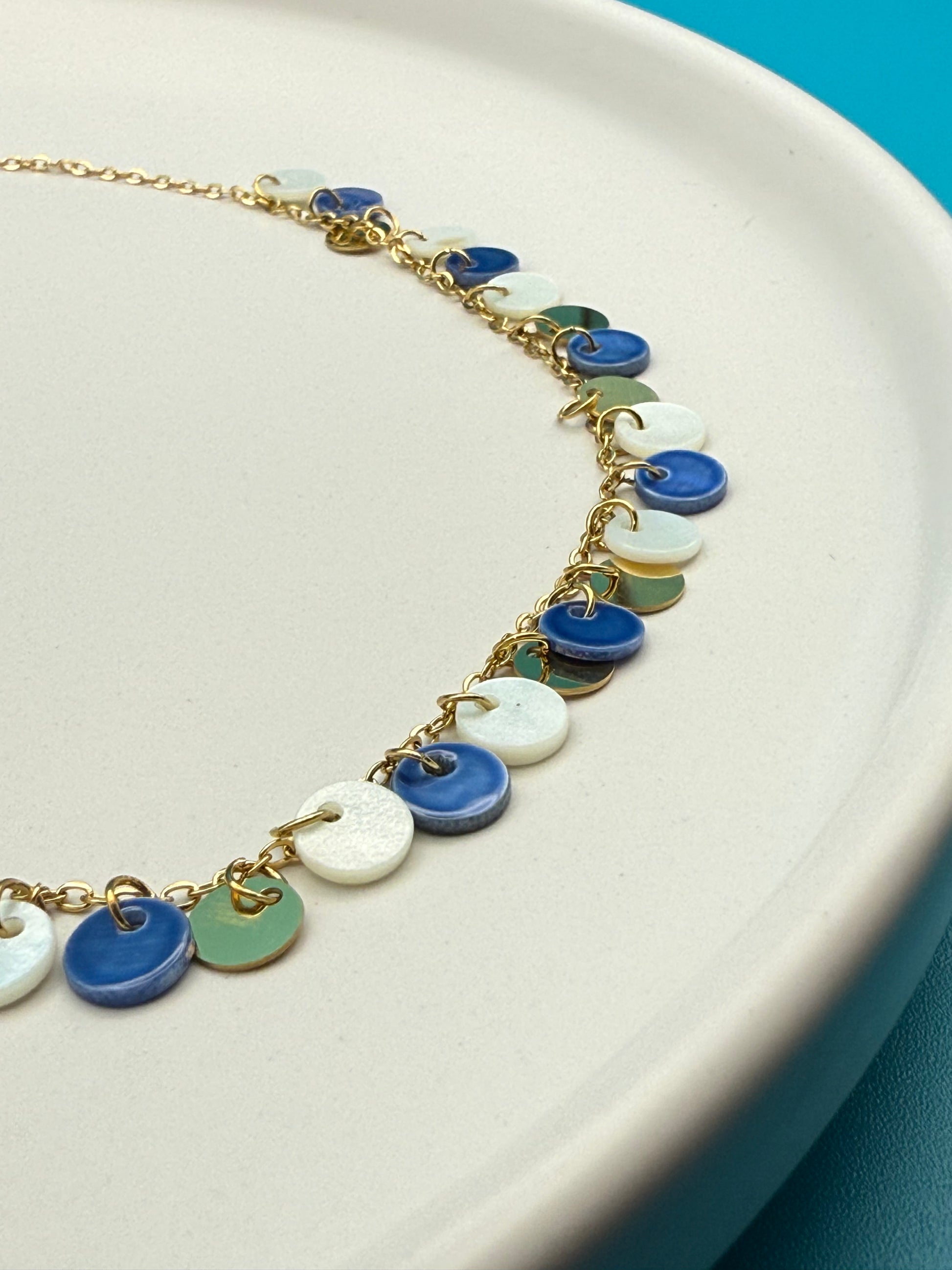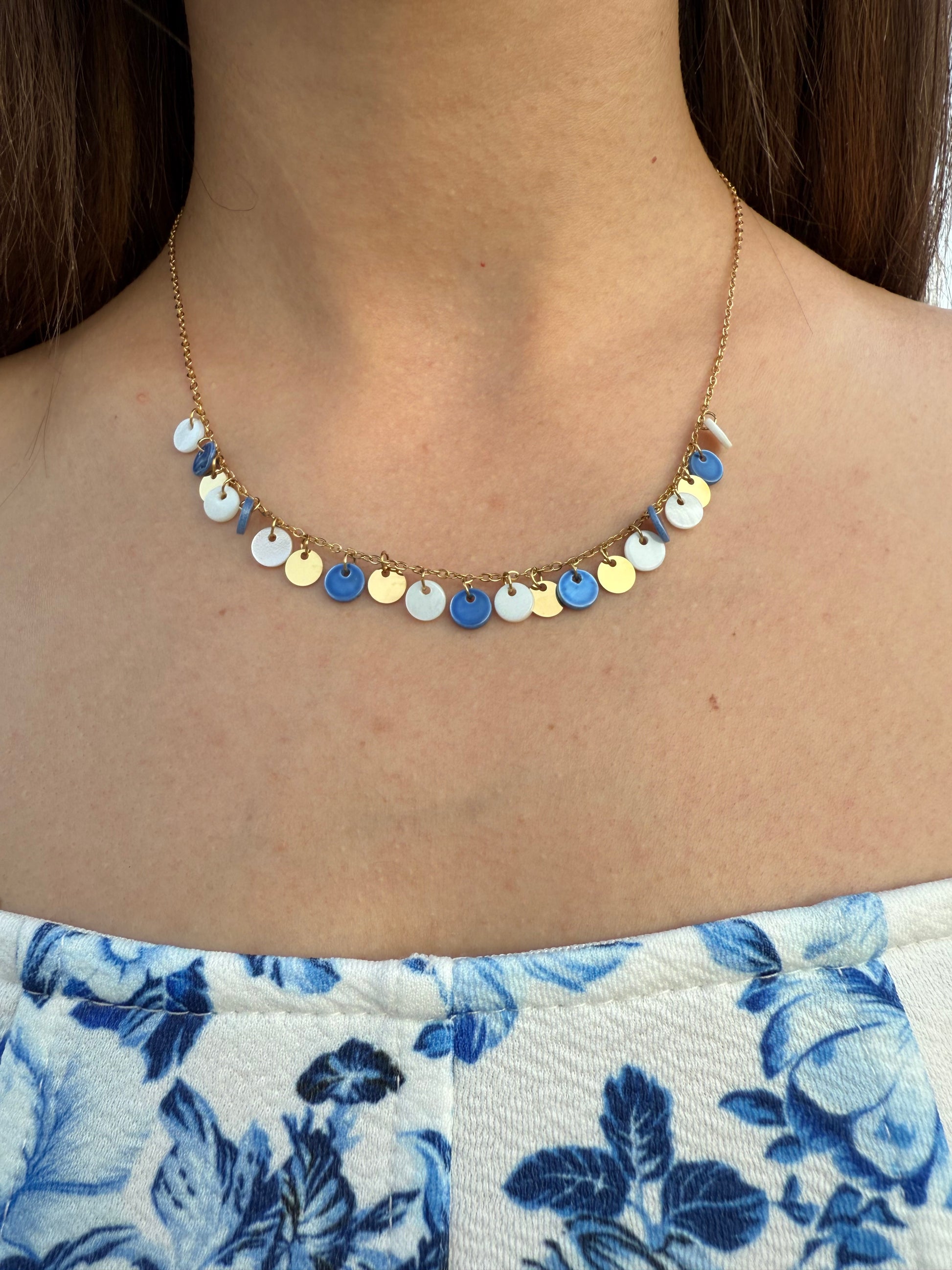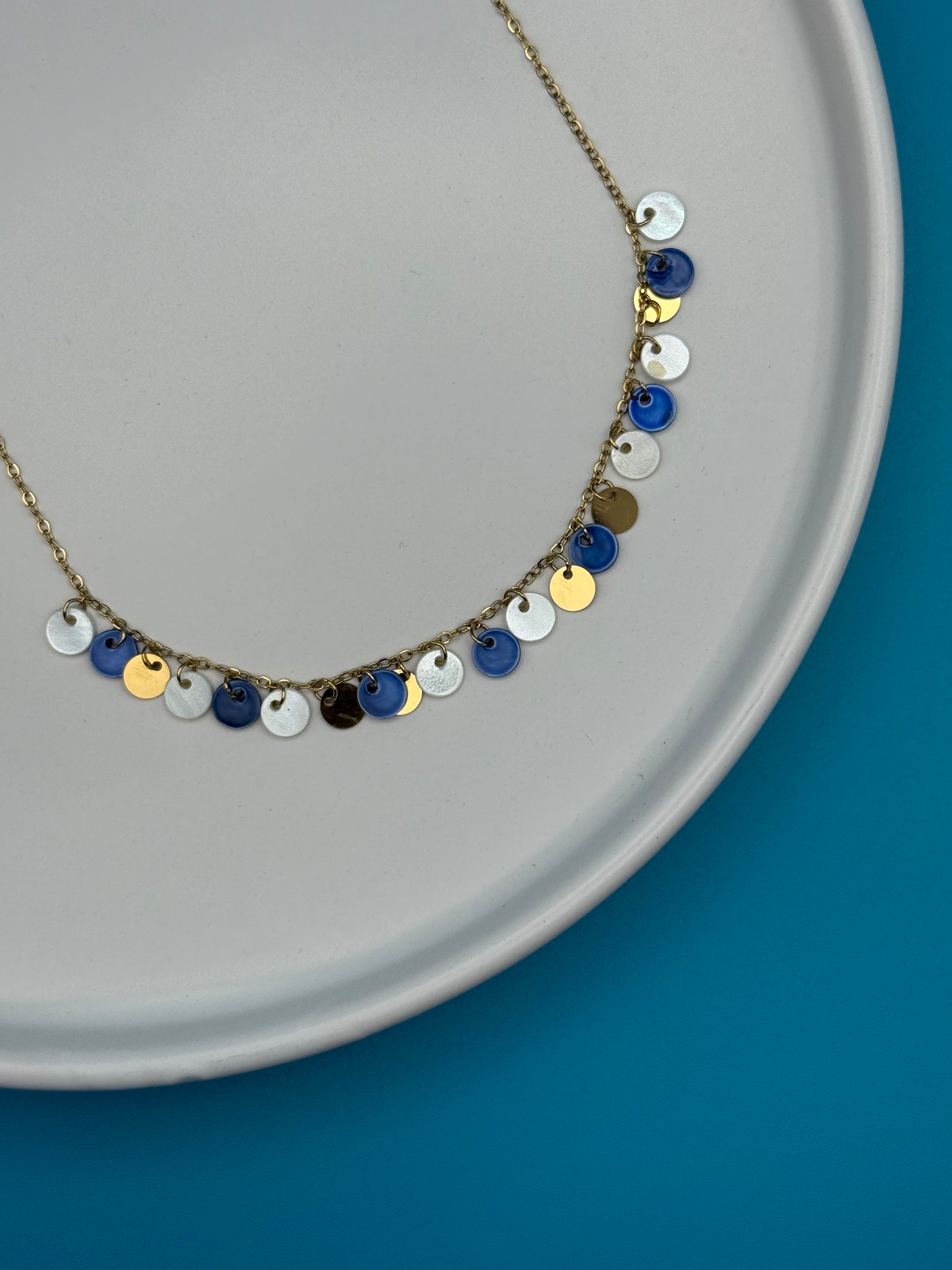 Το Caelum Mareque είναι ένα κομψό κολιέ από ανοξείδωτο ατσάλι με γαλάζιες και λευκές λεπτομέρειες, εμπνευσμένο από τα χρώματα του ουρανού και της θάλασσας. Ανθεκτικό και ελαφρύ, αποπνέει δροσιά και γαλήνη—ιδανικό για καλοκαιρινές εμφανίσεις με minimal χαρακτήρα.