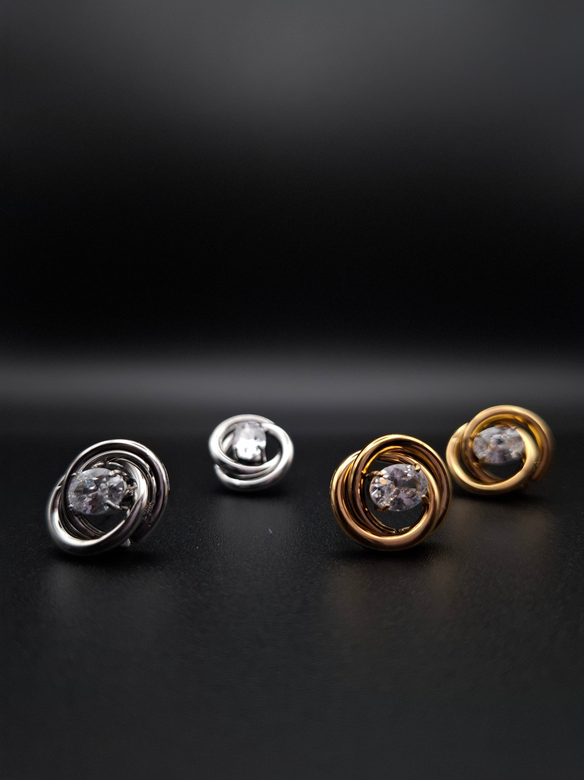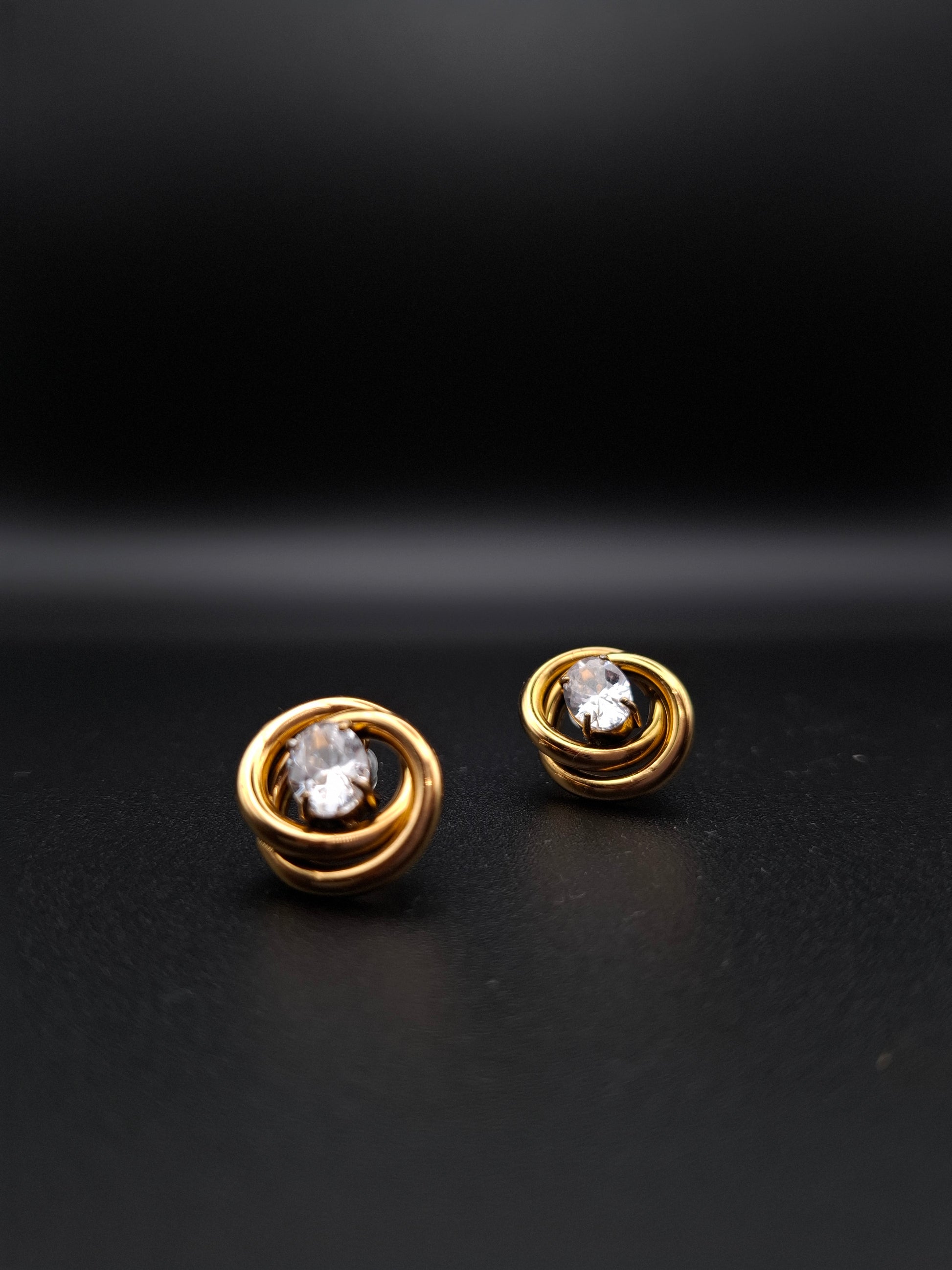 Κομψά σκουλαρίκια από ανοξείδωτο ατσάλι με χρυσή επιμετάλλωση, σχεδιασμένα σε μοντέρνο πλεκτό στυλ που αγκαλιάζει μια λαμπερή κεντρική πέτρα. Ιδανικά για να προσθέσουν διακριτική λάμψη και κομψότητα σε κάθε εμφάνιση.