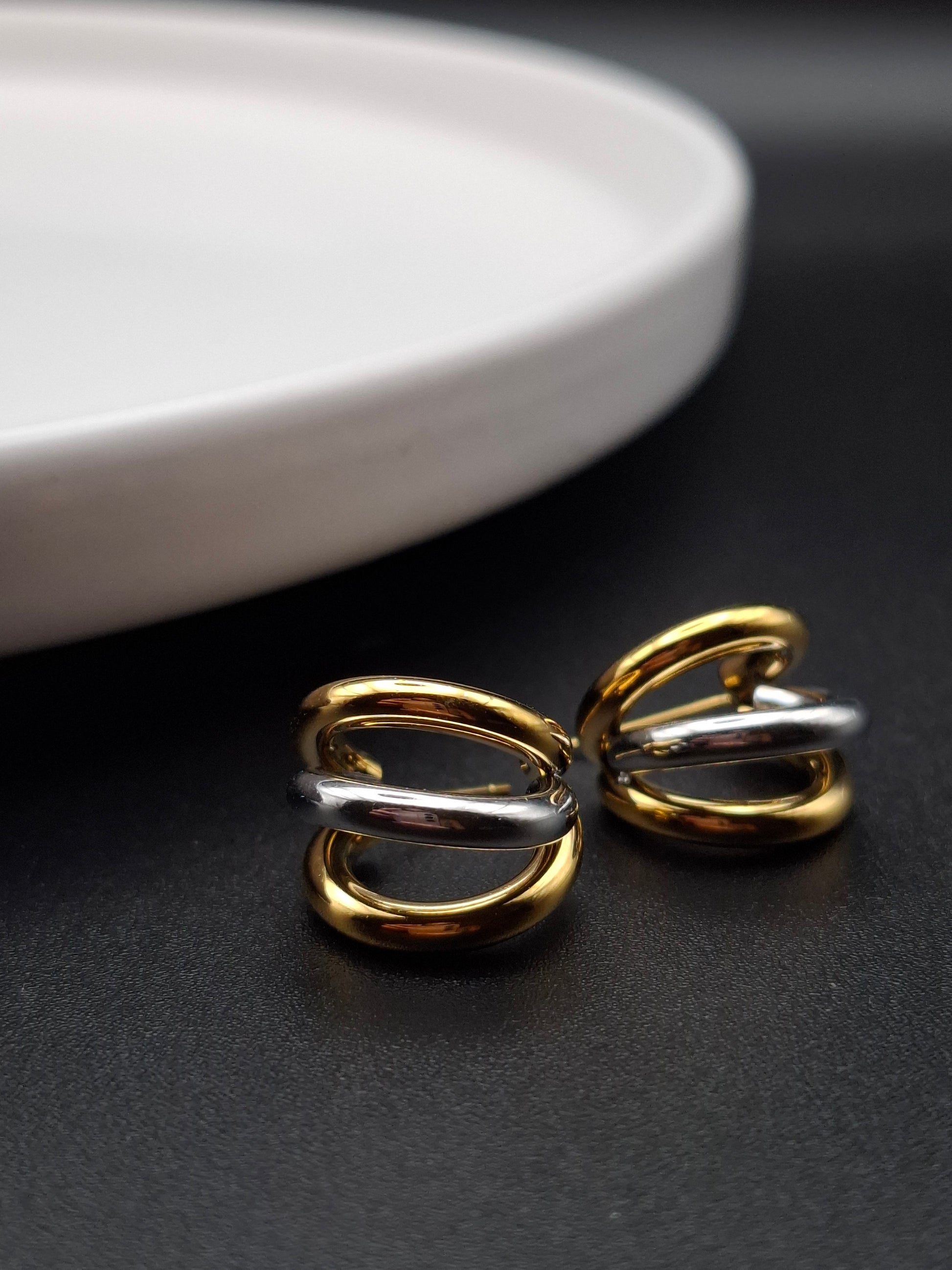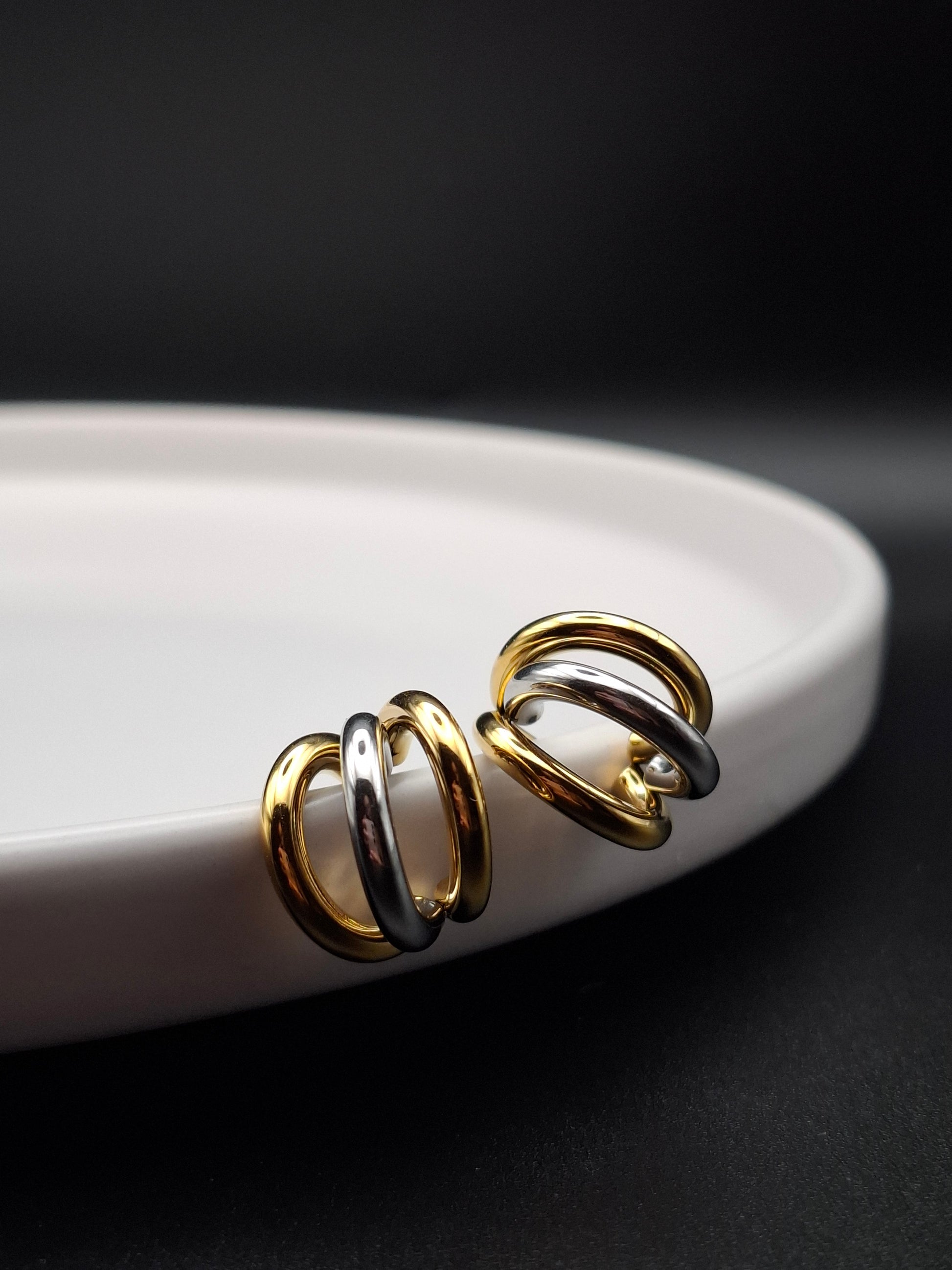 Minimal και ταυτόχρονα εντυπωσιακοί, οι κρίκοι Doppio συνδυάζουν χρυσό και ασημί τόνο σε ένα μοντέρνο σχέδιο. Κατασκευασμένοι από ανοξείδωτο ατσάλι, είναι ανθεκτικοί, υποαλλεργικοί και ιδανικοί για καθημερινή χρήση χωρίς να χάνουν τη λάμψη τους. Το must-have κόσμημα για κάθε σύγχρονη συλλογή.