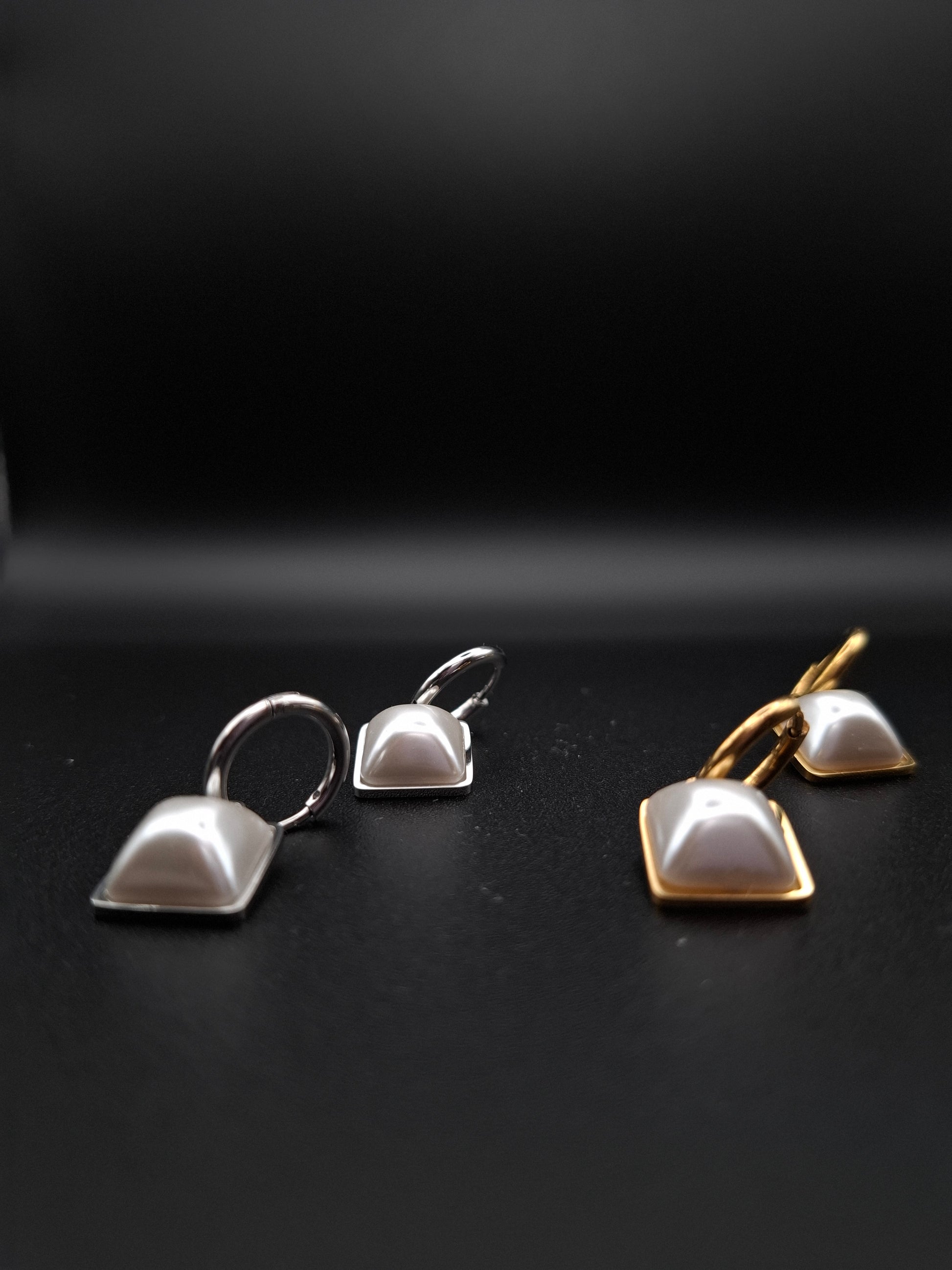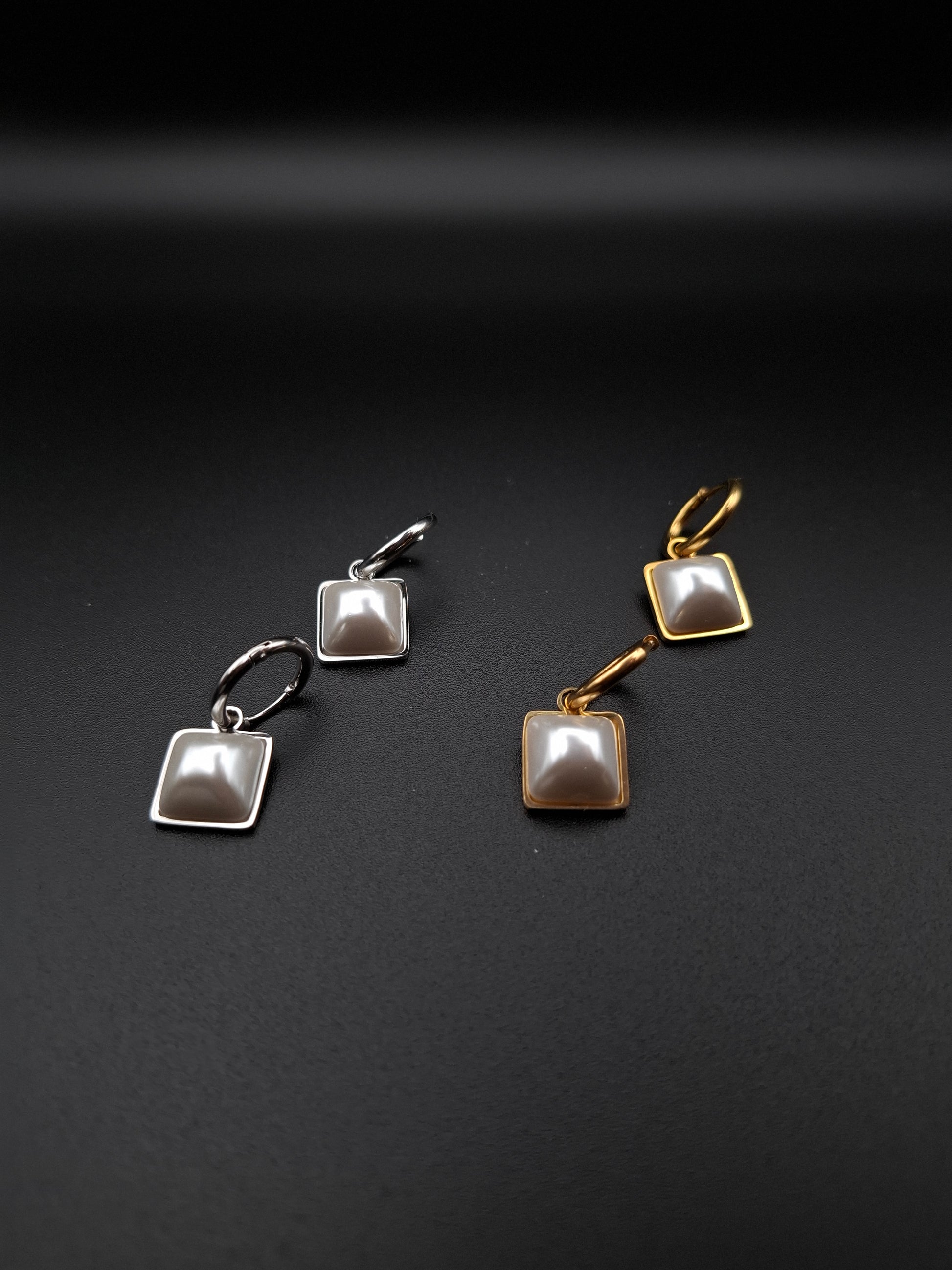 Σκουλαρίκια από ανοξείδωτο ατσάλι με κρεμαστό τετράγωνο στοιχείο και μαργαριταρένια όψη, διαθέσιμα σε χρυσή και ασημί απόχρωση. Ένα κομψό και διαχρονικό σχέδιο που αποπνέει φινέτσα και πολυτέλεια.