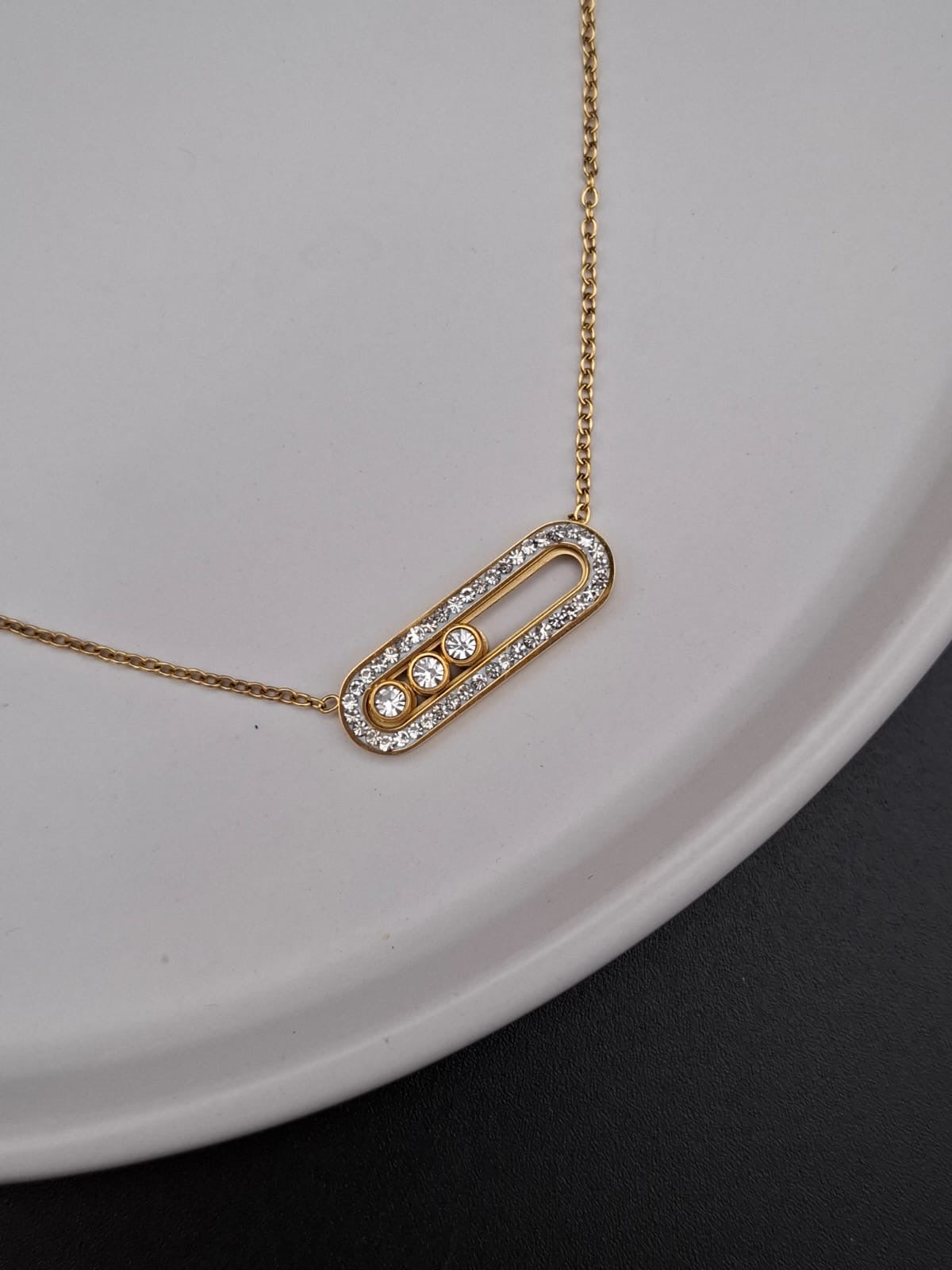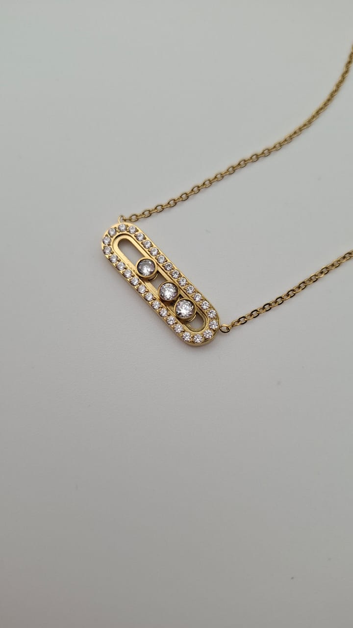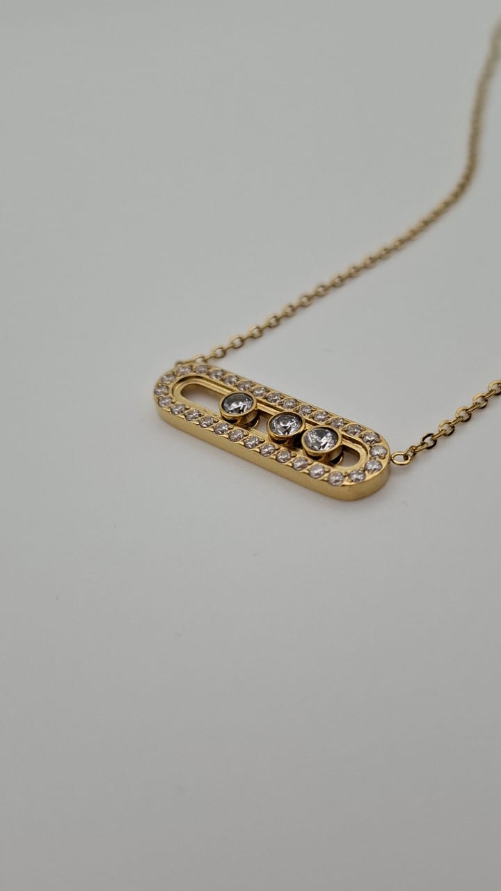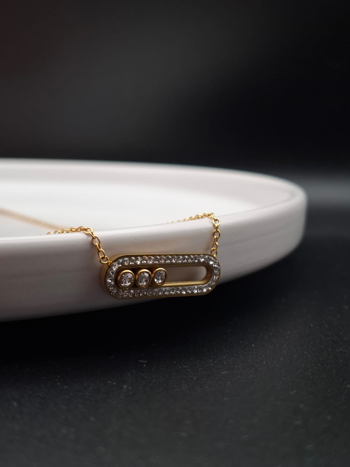 Κολιέ Luxus Trinitas με τρεις κεντρικές λαμπερές πέτρες και λεπτομέρειες ζιργκόν στο περίγραμμα. Κομψό και εκλεπτυσμένο, αποπνέει διαχρονική πολυτέλεια για κάθε περίσταση.