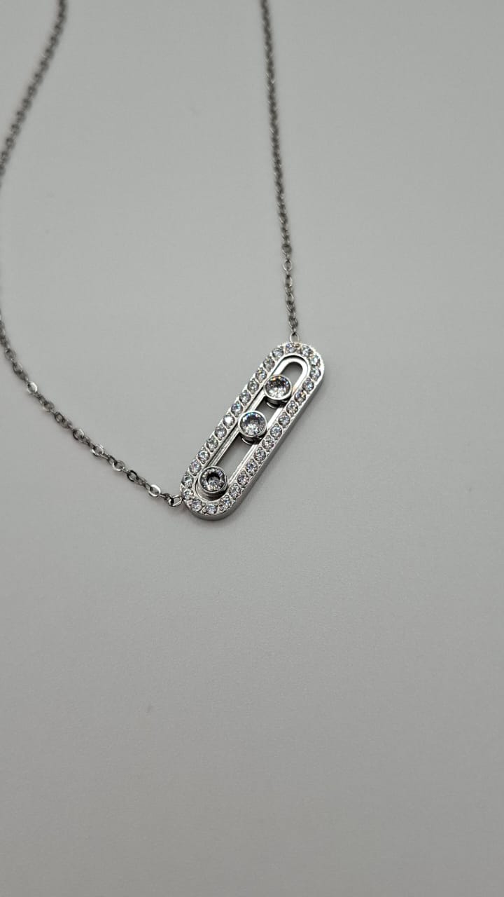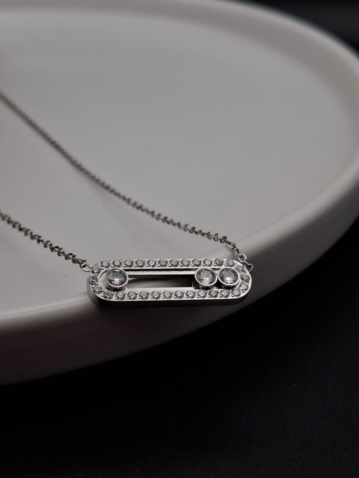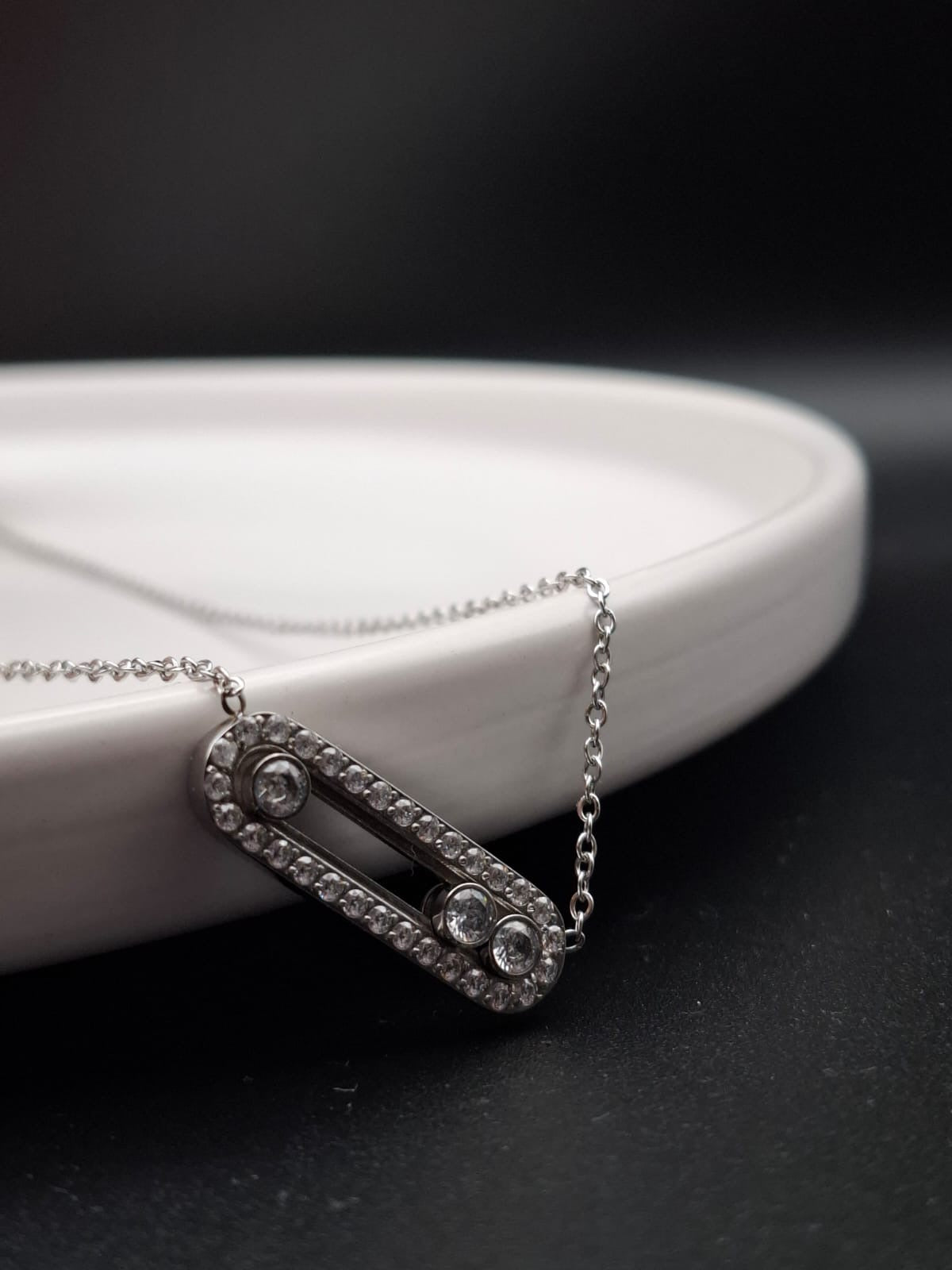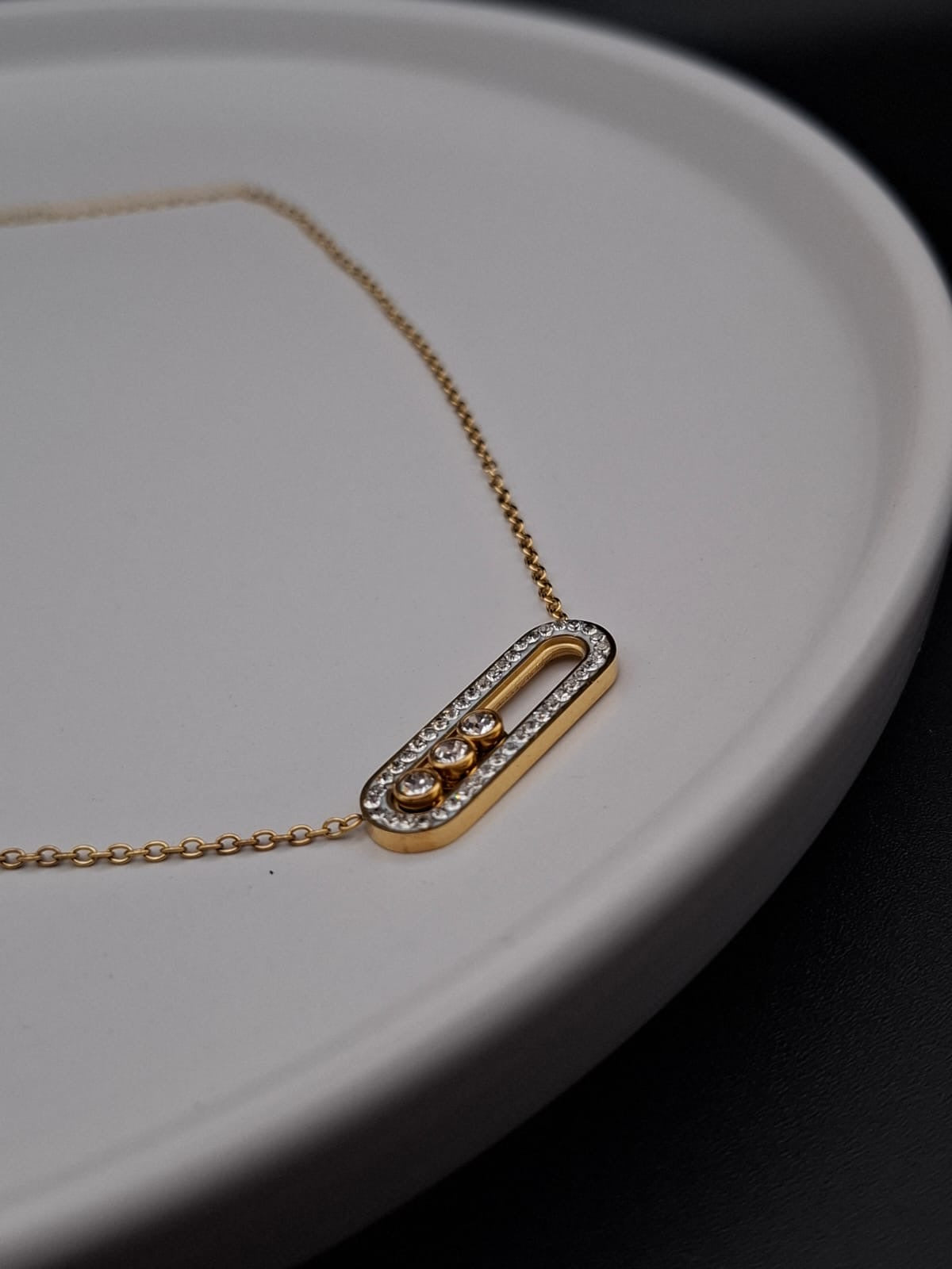 Κολιέ Luxus Trinitas με τρεις κεντρικές λαμπερές πέτρες και λεπτομέρειες ζιργκόν στο περίγραμμα. Κομψό και εκλεπτυσμένο, αποπνέει διαχρονική πολυτέλεια για κάθε περίσταση.