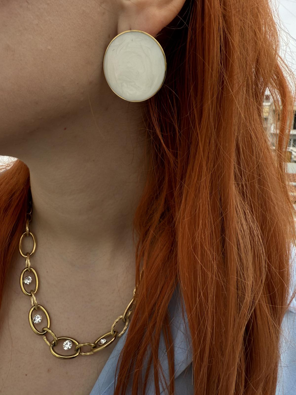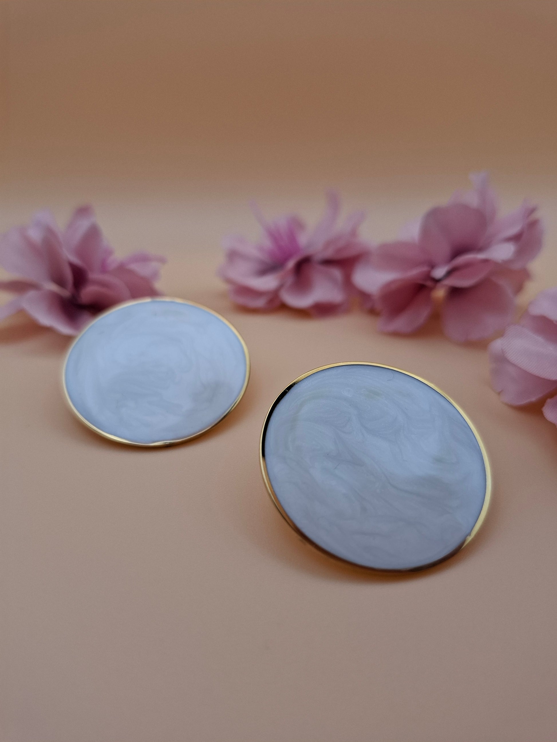 Στρογγυλά, minimal και κομψά σκουλαρίκια από ανοξείδωτο ατσάλι, σε λευκό χρώμα, με χρυσό περίγραμμα που προσθέτει μια αίσθηση πολυτέλειας και φινέτσας. Αυτά τα σκουλαρίκια συνδυάζουν την απλότητα με την κομψότητα, κάνοντάς τα ιδανικά για καθημερινές εμφανίσεις ή για μια πιο εκλεπτυσμένη βραδινή εμφάνιση. Ένα διαχρονικό και ευέλικτο αξεσουάρ που ενσωματώνει τη minimal αισθητική με την κλασική γοητεία.