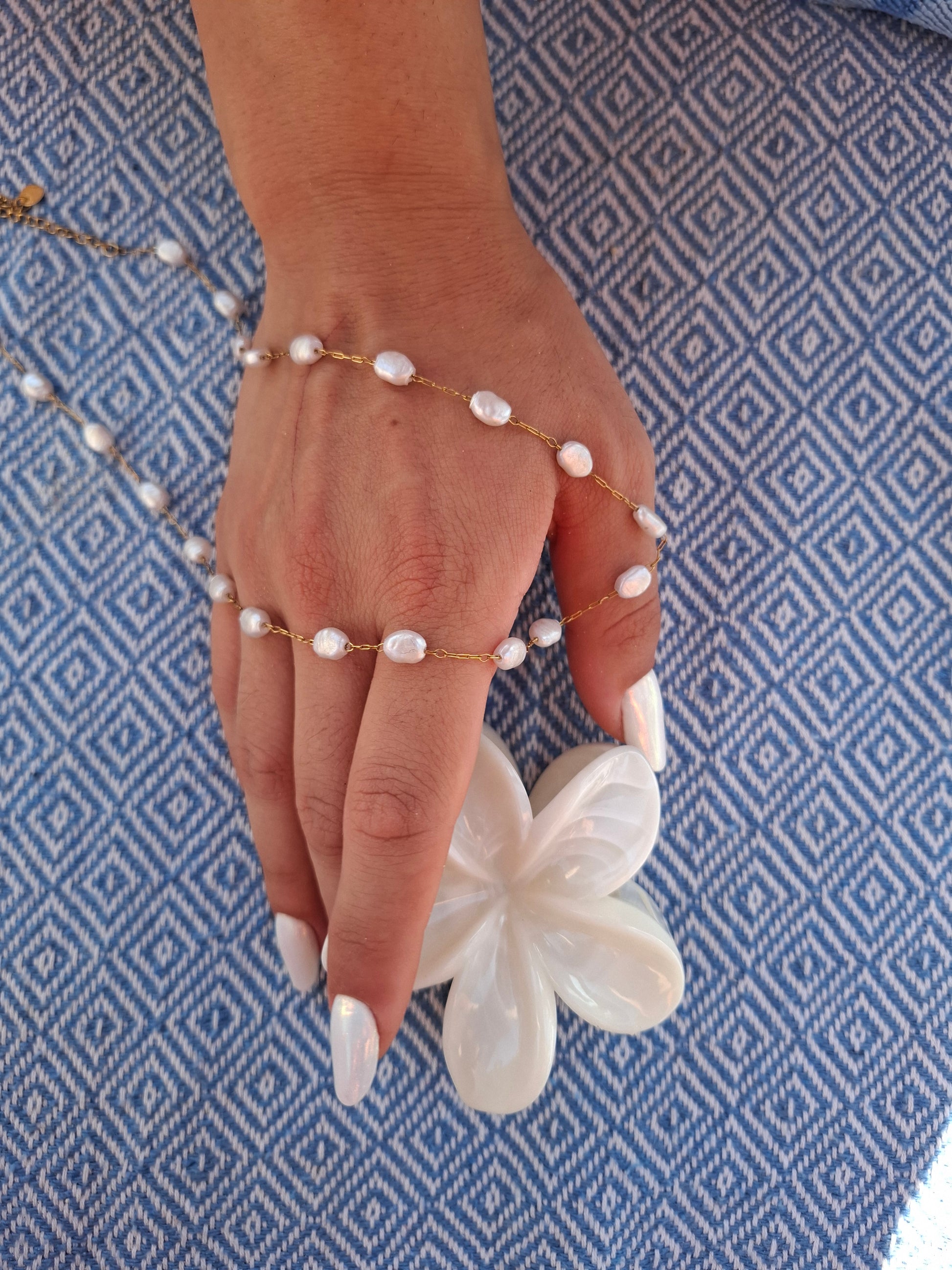 Το Perla Dorata είναι ένα κομψό κολιέ από ανοξείδωτο ατσάλι με λευκά μαργαριταράκια, που συνδυάζει διαχρονική κομψότητα με ανθεκτικότητα. Ιδανικό για να ολοκληρώνει κάθε σας εμφάνιση με ρομαντική λάμψη.