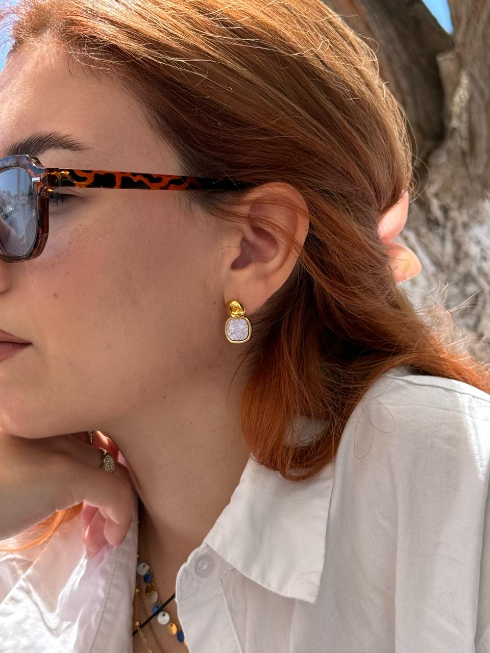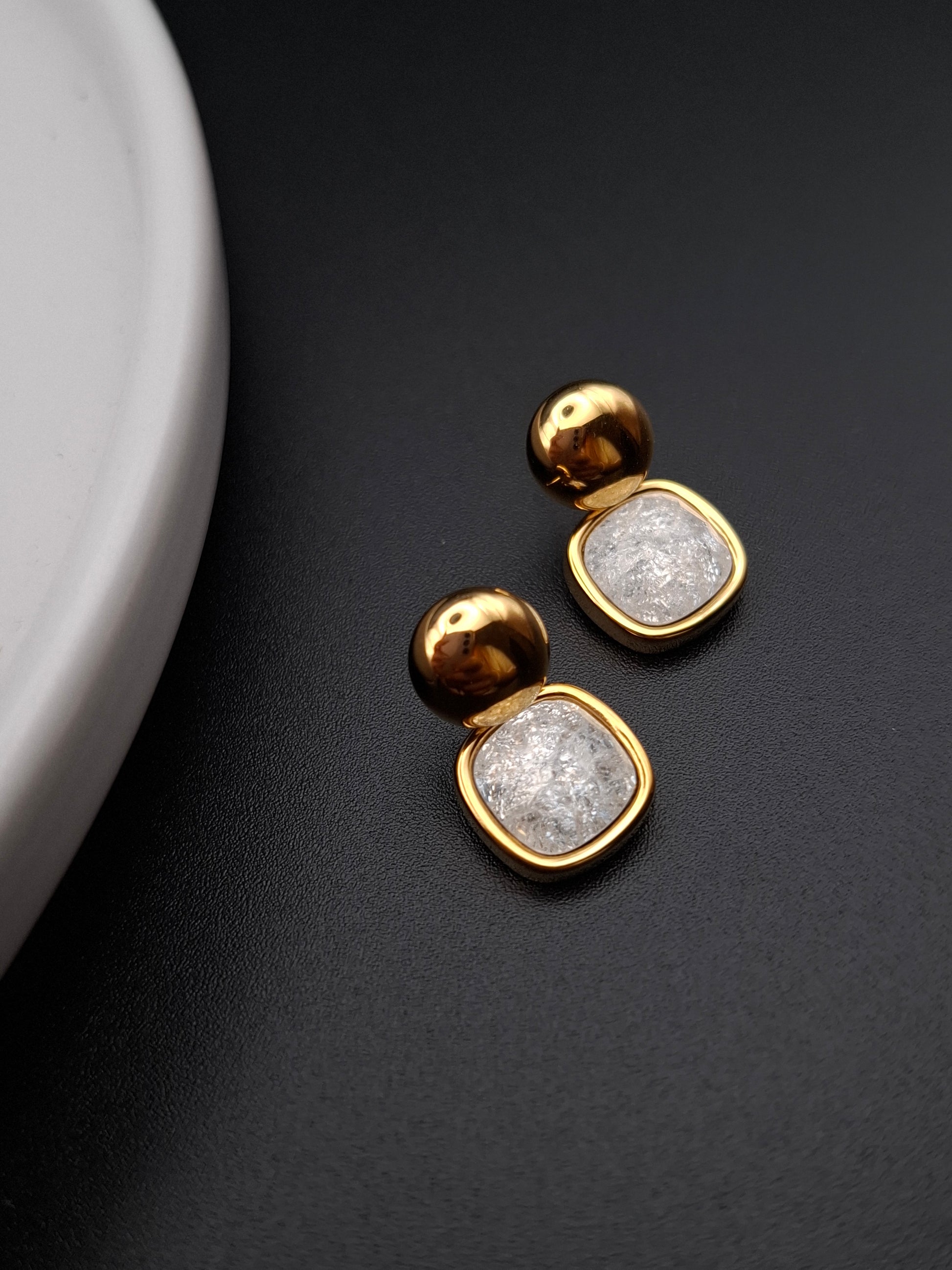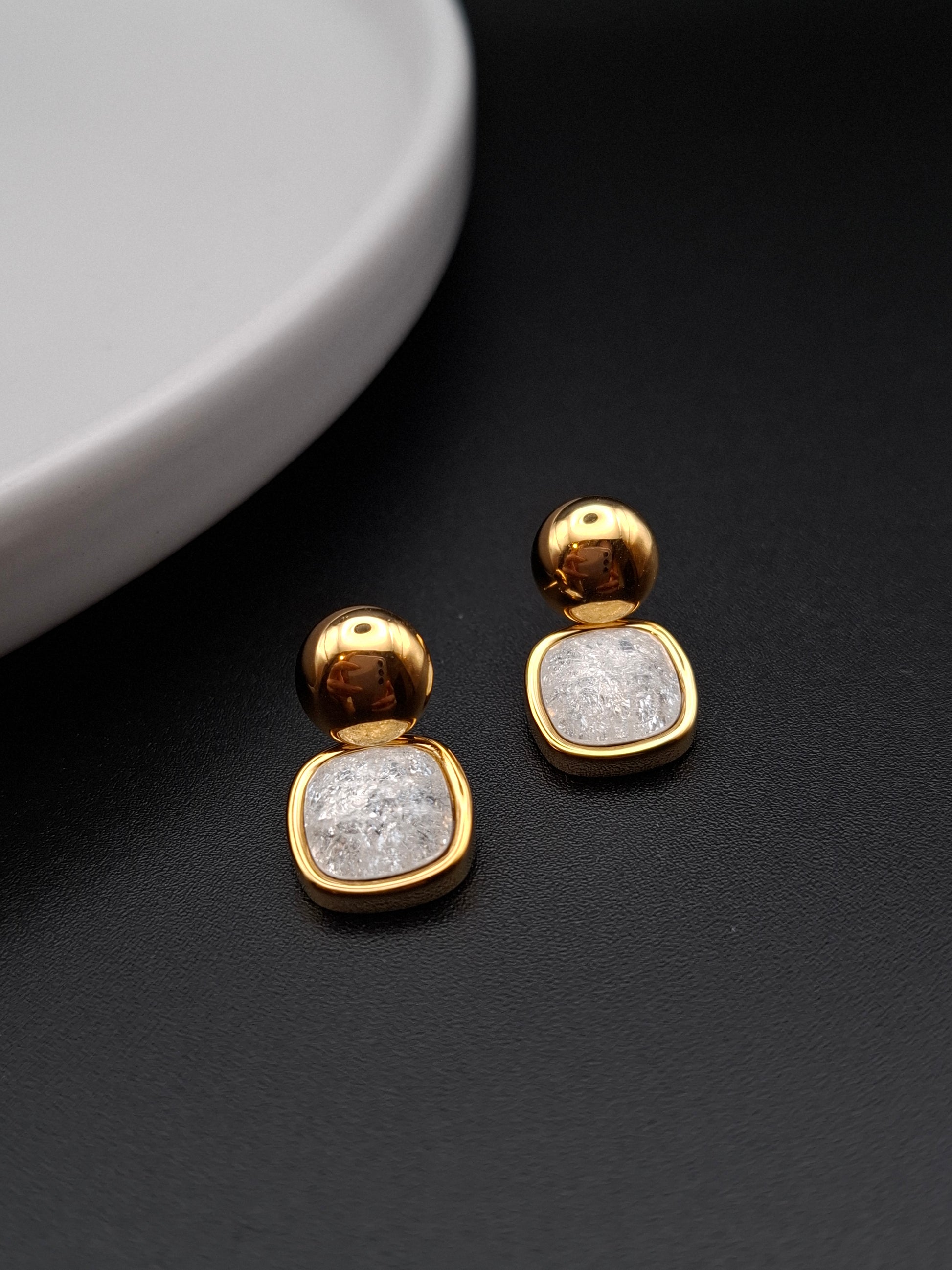 Τα Quartz Touch είναι κομψά σκουλαρίκια από ανοξείδωτο ατσάλι σε χρυσό χρώμα, διαθέτουν μικρό τετράγωνο σχήμα, προσφέροντας μία εκλεπτυσμένη και μοντέρνα αίσθηση. Στο κέντρο υπάρχει μία λευκή πέτρα με φυσικά νερά, η οποία δημιουργεί μία εξαιρετική αντίθεση με το χρυσό φινίρισμα. Ο συνδυασμός του χρυσού ατσαλιού και της λευκής πέτρας προσφέρει μία κομψή και λαμπερή εμφάνιση, ιδανική για κάθε περίσταση, είτε πρόκειται για μία βραδινή έξοδο, είτε για καθημερινή χρήση με στυλ.