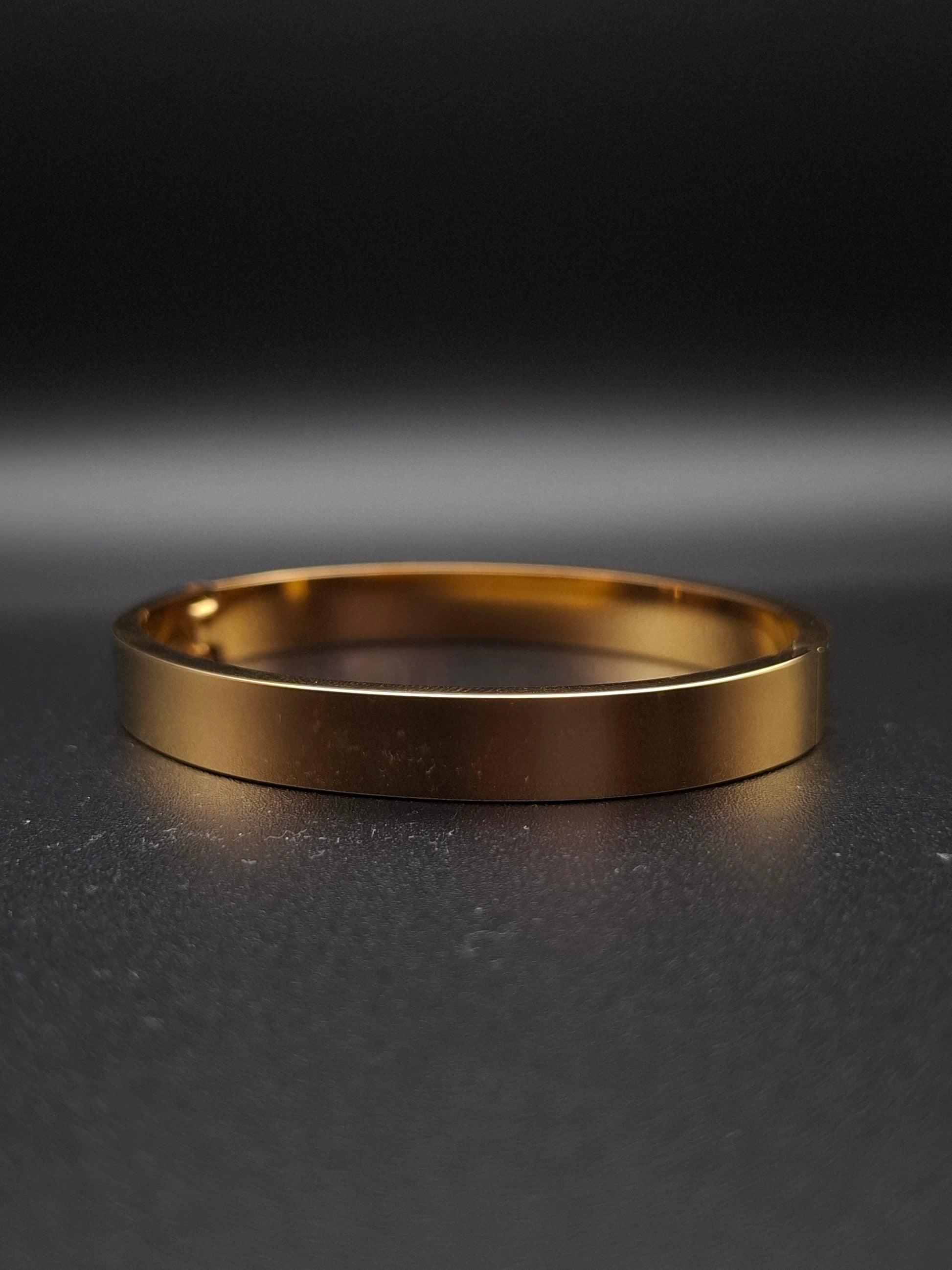 Minimal βραχιόλι από ανοξείδωτο ατσάλι σε χρυσή απόχρωση, με κομψό και διαχρονικό σχεδιασμό. Η λεία, γυαλιστερή επιφάνειά του το καθιστά ιδανικό για κάθε περίσταση, είτε φοριέται μόνο του είτε σε layering με άλλα κοσμήματα.