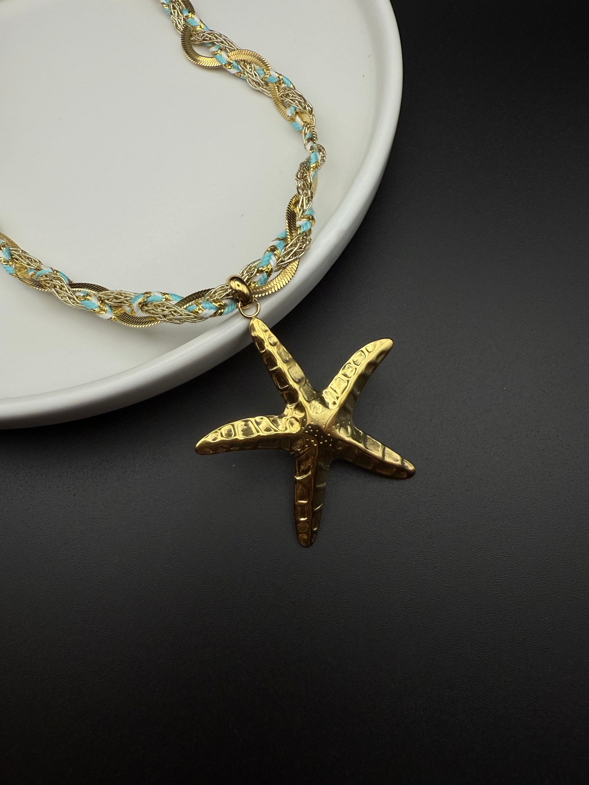 Ανακαλύψτε τη μαγεία της θάλασσας με το κολιέ Stella Maris, εμπνευσμένο από τη γοητεία των ωκεανών και τη λάμψη του καλοκαιρινού ήλιου. Με εντυπωσιακό μενταγιόν σε σχήμα χρυσού αστερία και πλεκτή αλυσίδα σε αποχρώσεις του γαλάζιου και του χρυσού, είναι κατασκευασμένο από ανοξείδωτο ατσάλι για να διατηρεί τη λάμψη του στον χρόνο. Ένα κόσμημα που συνδυάζει κομψότητα και καλοκαιρινή αύρα – ιδανικό για κάθε στιγμή.
