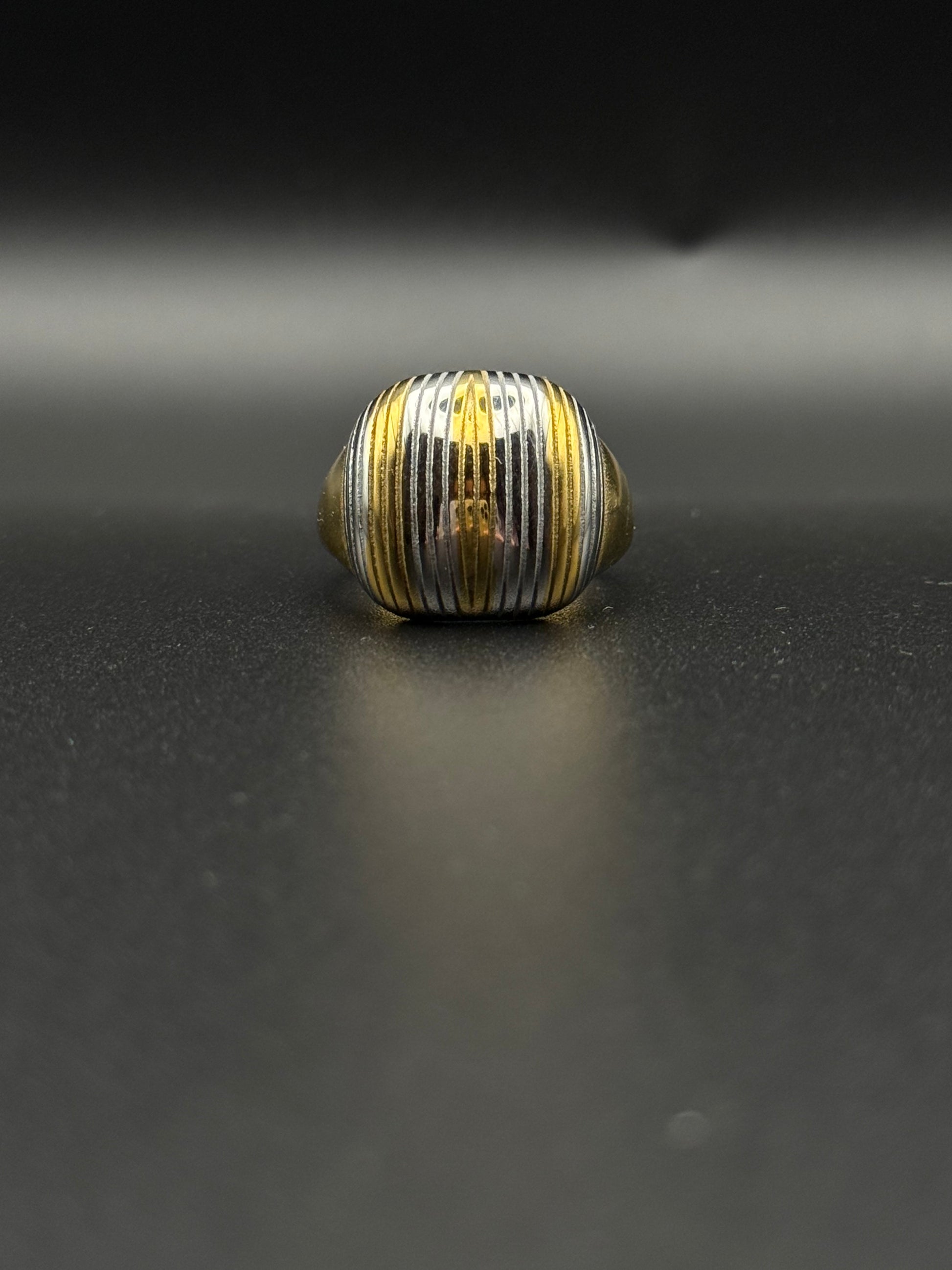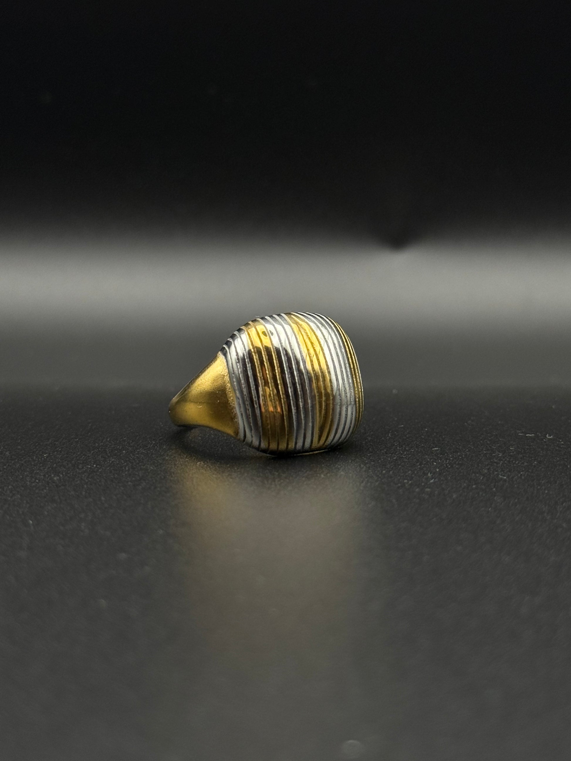 Ένα statement δαχτυλίδι από ανοξείδωτο ατσάλι, με ανάγλυφο σχέδιο και διχρωμία σε χρυσό και ασημί που τραβά τα βλέμματα. Το Vox συνδυάζει δυναμισμό και κομψότητα, ιδανικό για όσους εκφράζονται μέσα από το στυλ τους. Ανθεκτικό, μοναδικό και φτιαγμένο για να ξεχωρίζει.