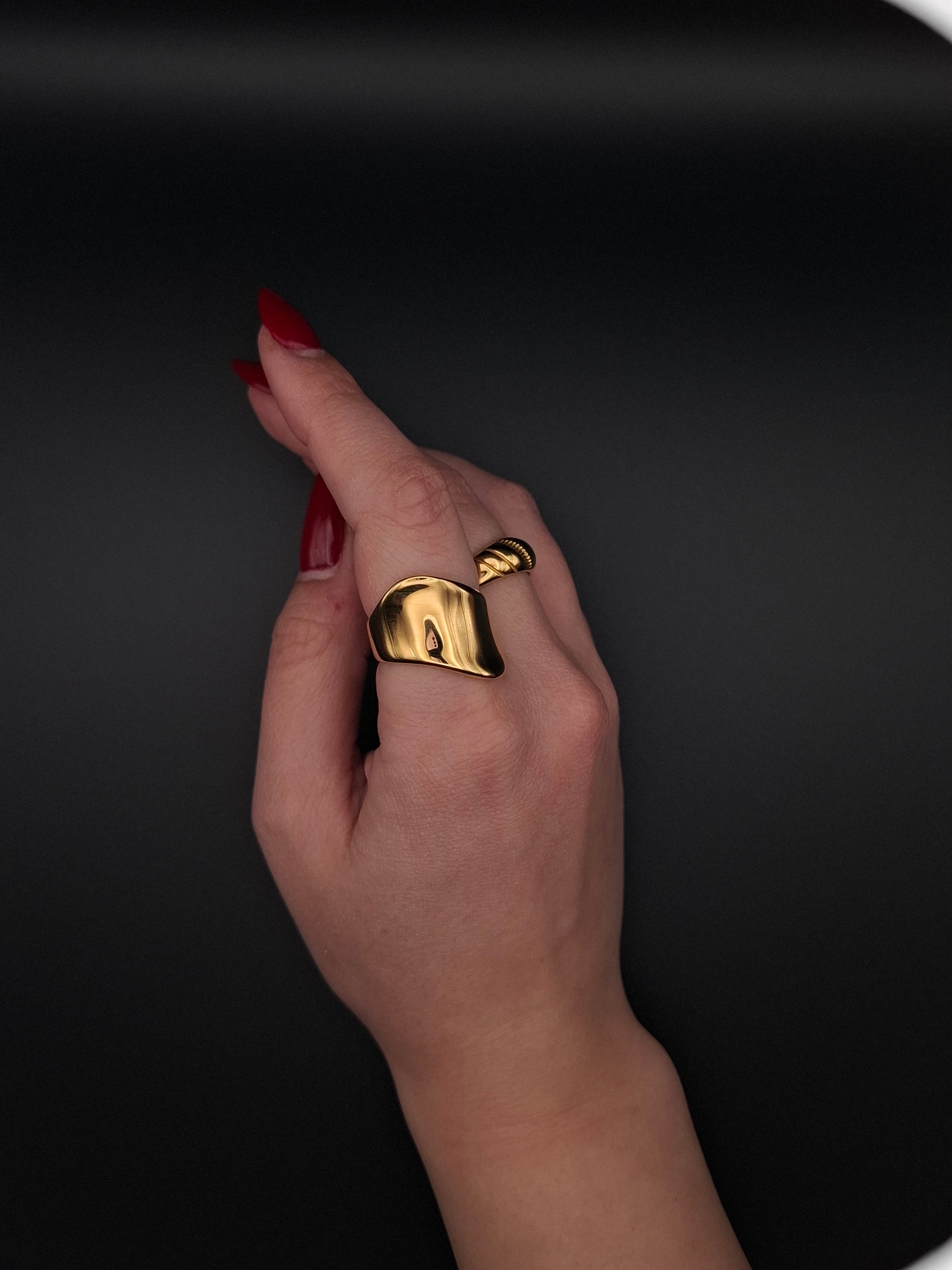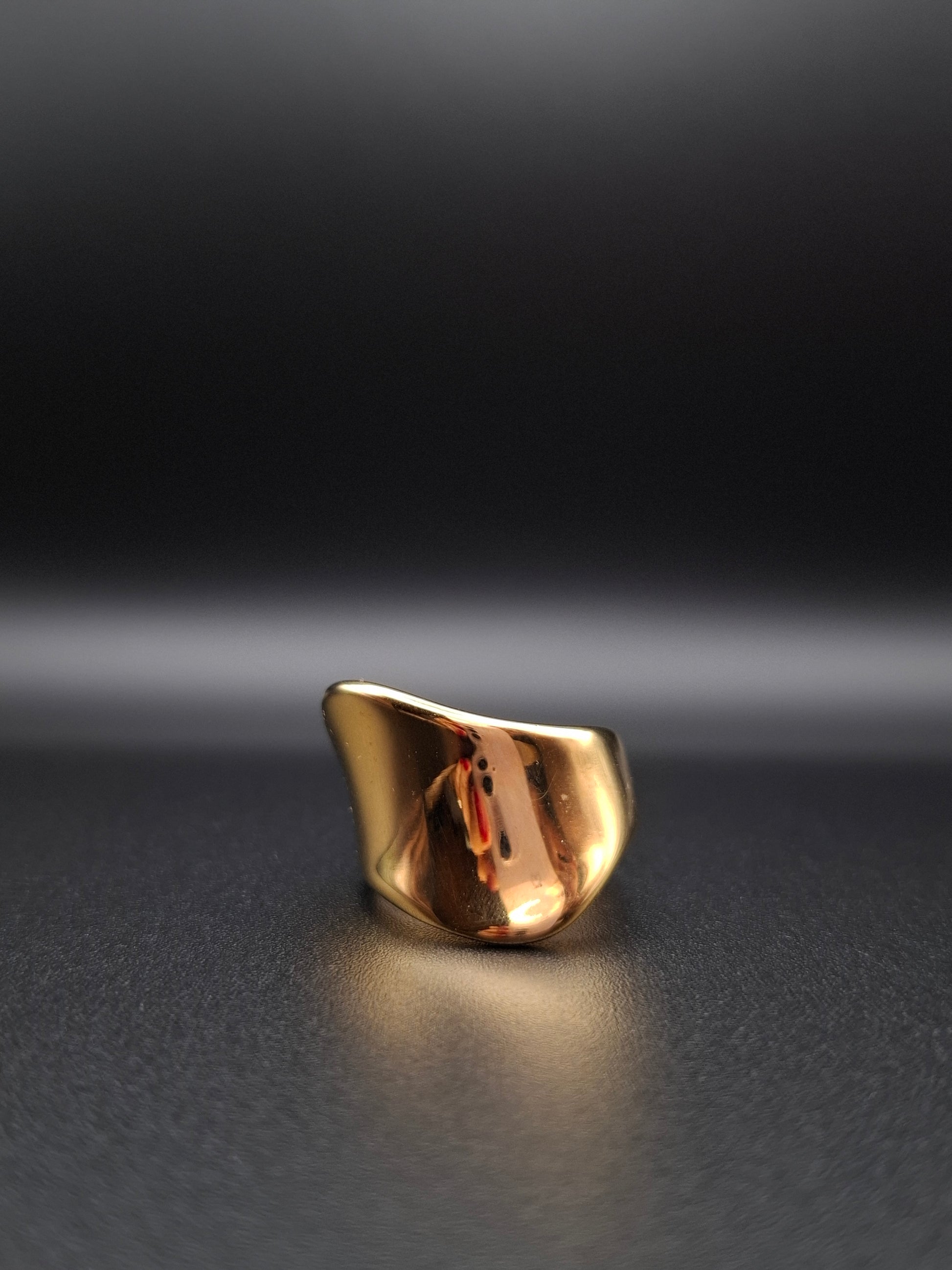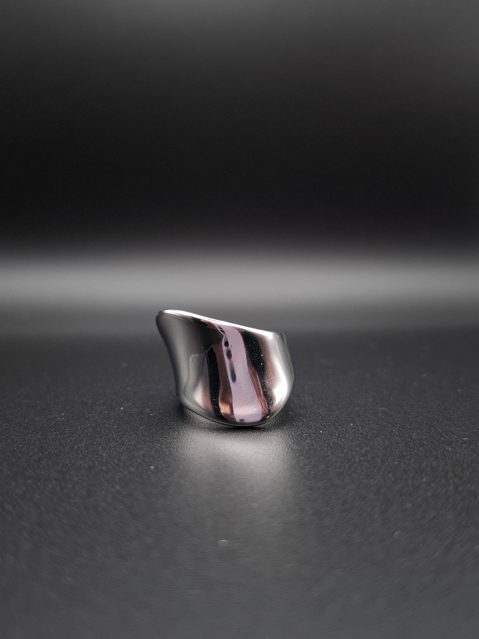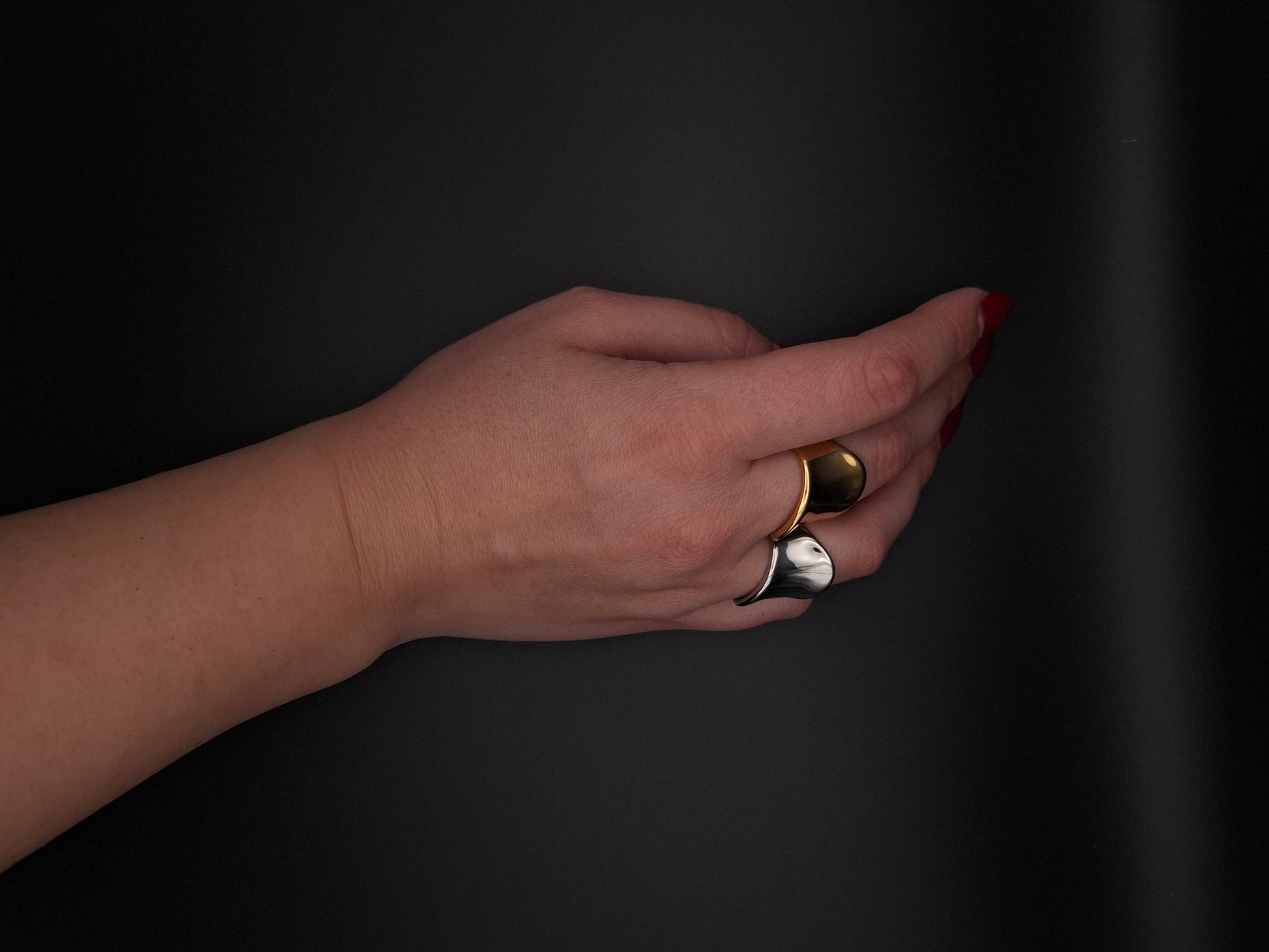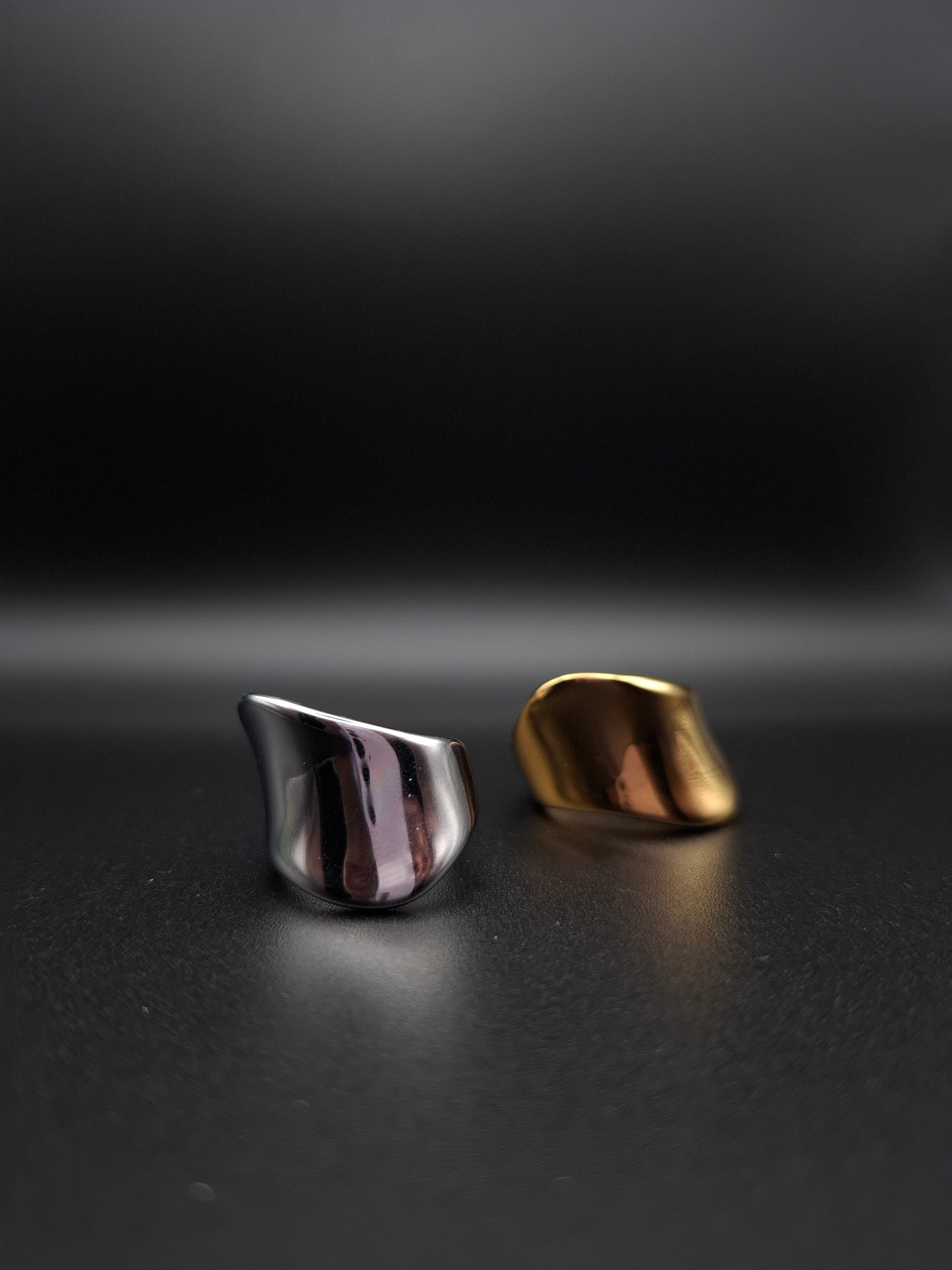 Minimal δαχτυλίδι από ανοξείδωτο ατσάλι με ασύμμετρο, κυματιστό design. Η λεία, καθρεφτίζουσα επιφάνειά του προσθέτει μια σύγχρονη και κομψή αισθητική, ιδανική για statement εμφανίσεις. Ανθεκτικό και κατάλληλο για καθημερινή χρήση.